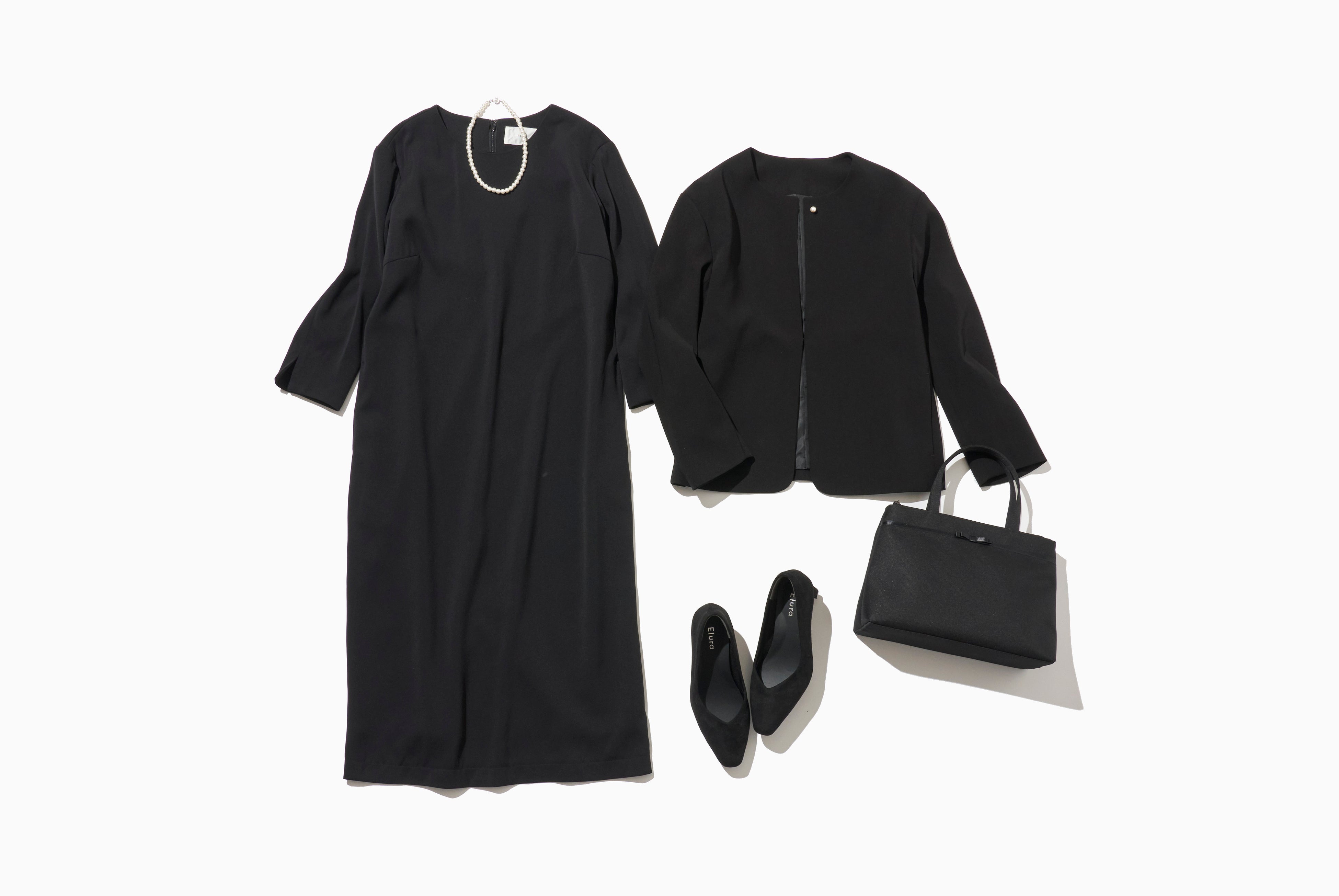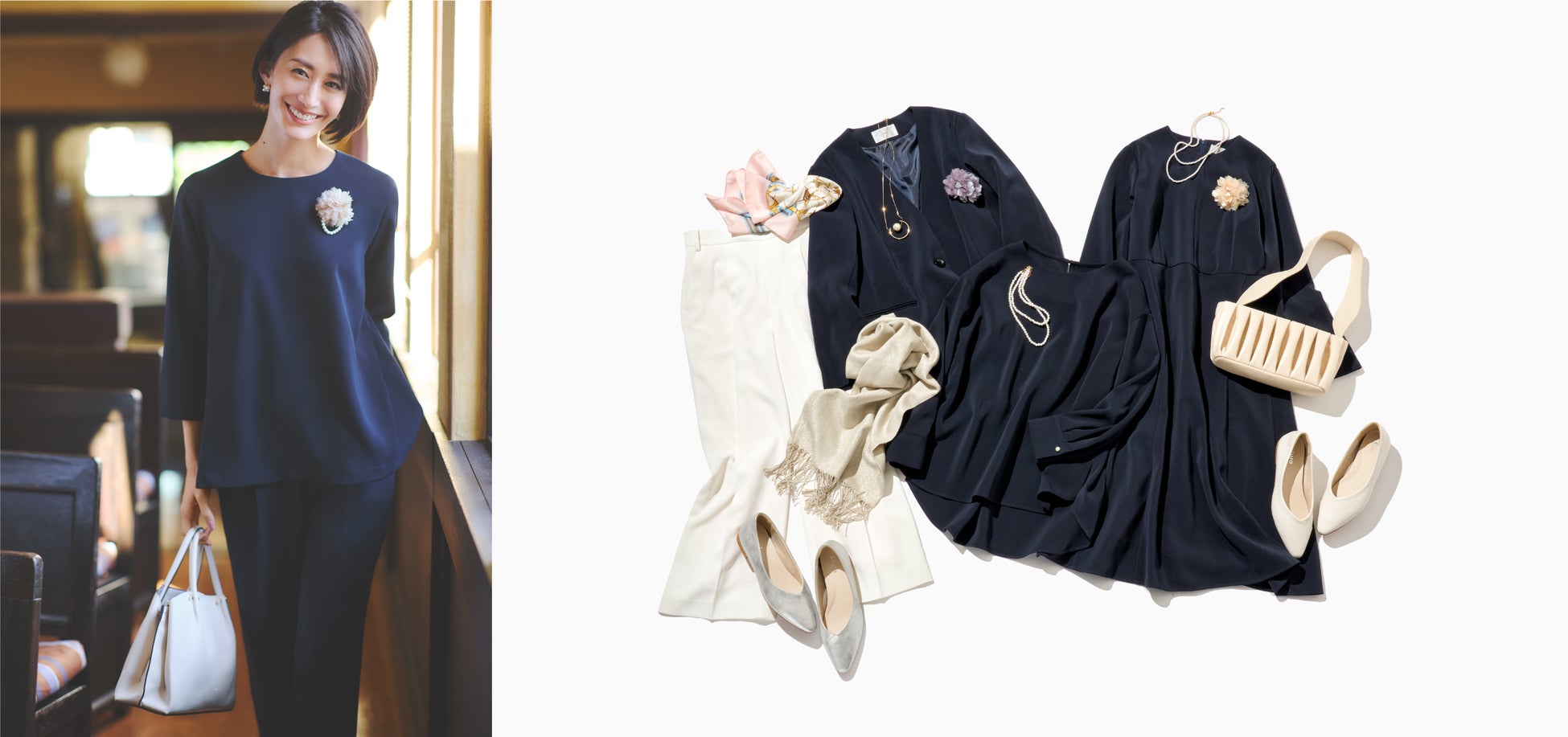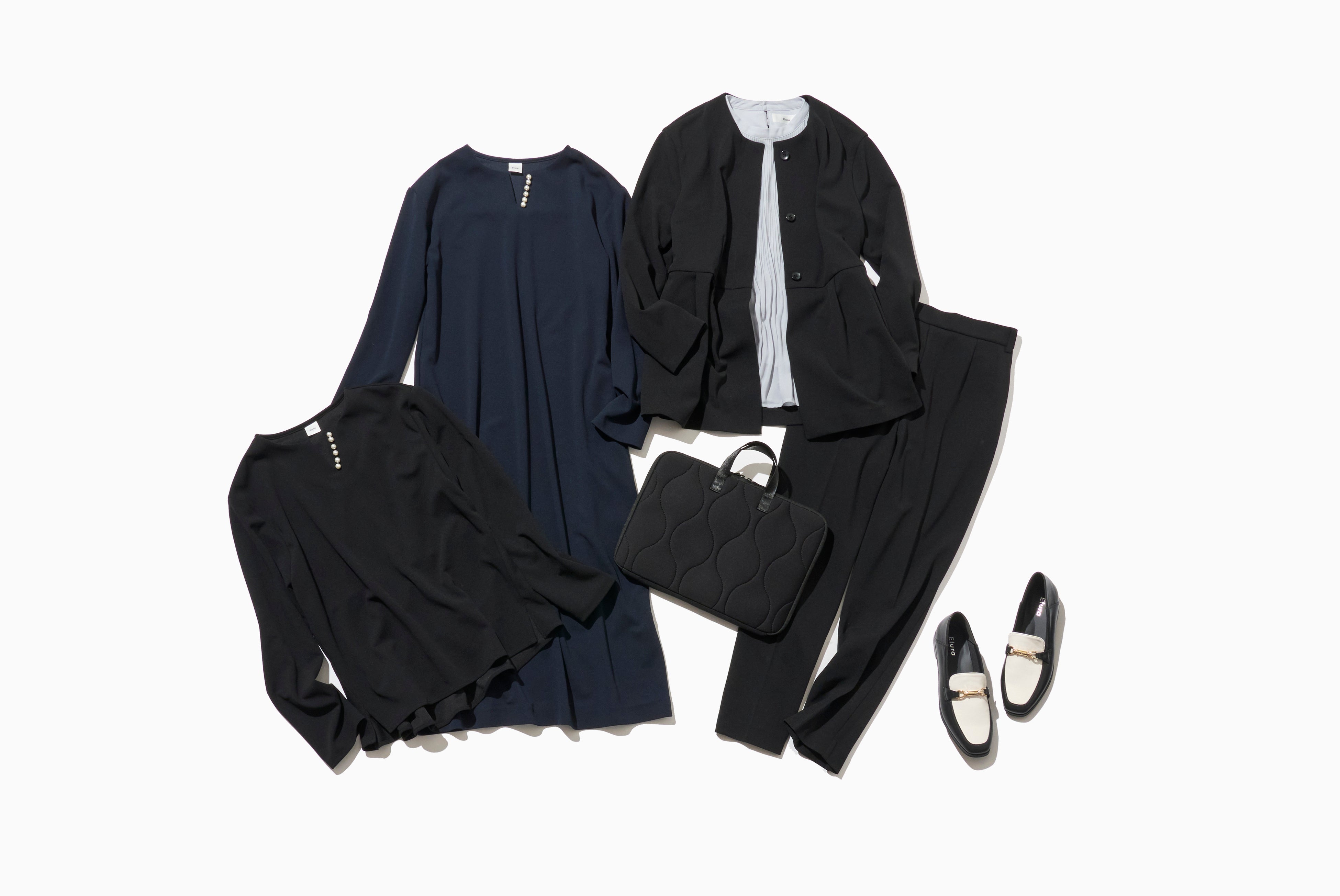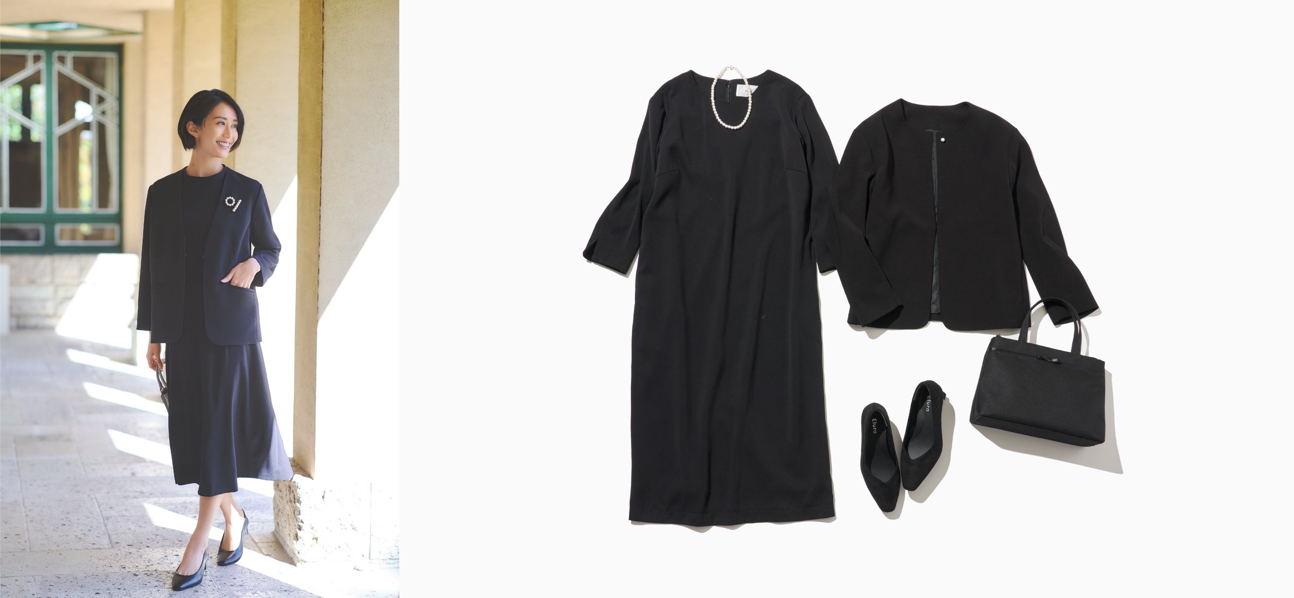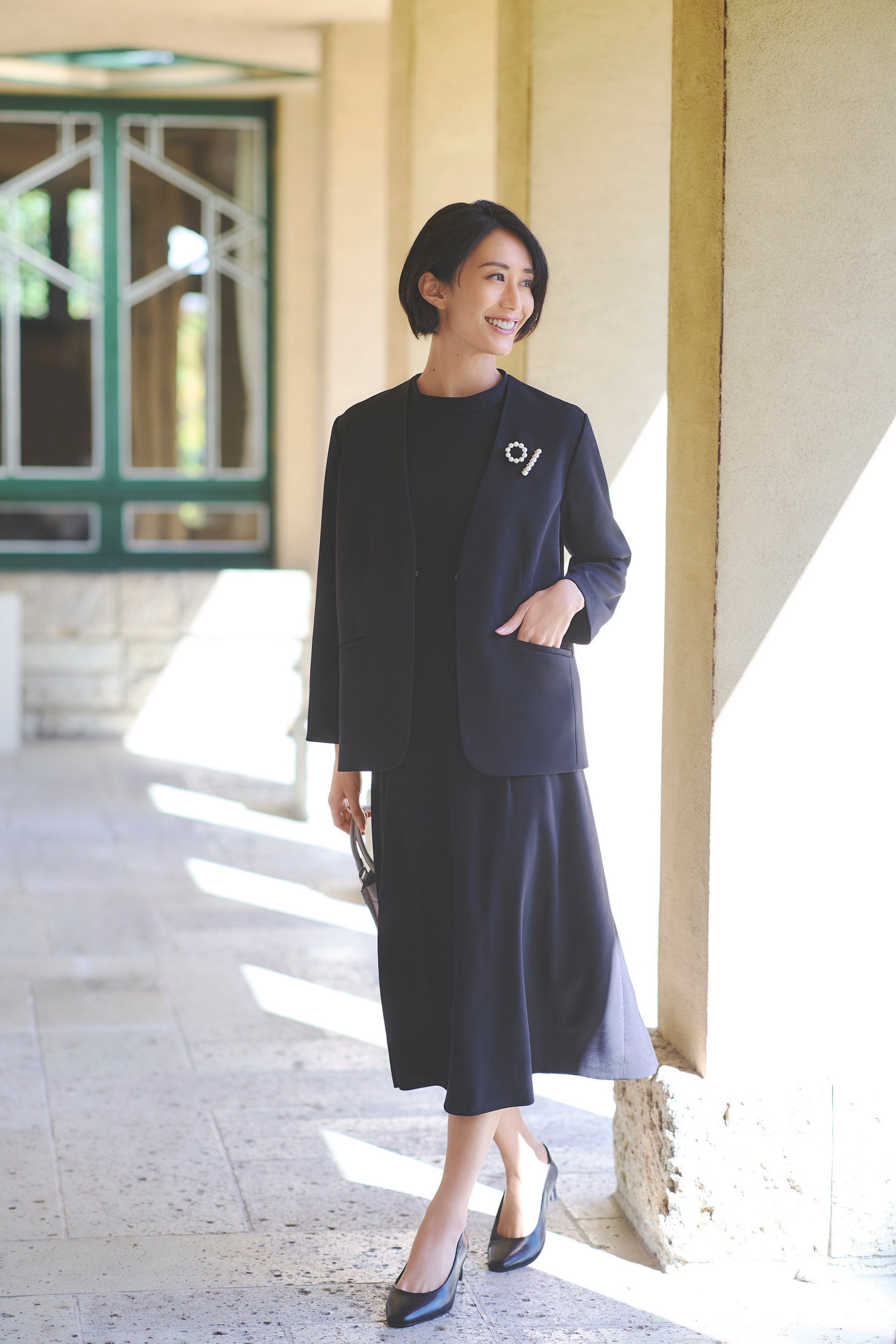 入卒式などのセレモニーに加え、お悔みの場や法事などブラックフォーマルとしても使用できるシリーズ。ハレの日にもお悔やみの日にもふさわしい大人の理想的なフォーマルアイテムです。華美な装飾を削ぎ落としたデザインと品のあるマットなブラックは知的で落ち着いた印象で、どんな校風の式典にも対応できる正統派の着こなしが完成します。またお悔やみの席にも使える素材を採用しているので、40デニールのストッキング、布製バッグや光沢のない靴、一連パールなどマナーに即したアイテムを合わせることでブラックフォーマルとしても問題なく活用可能です。今回は、お悔みの場で必要な小物も販売中。一緒にそろえておけばいざという時に慌てずに済むのでおすすめです。