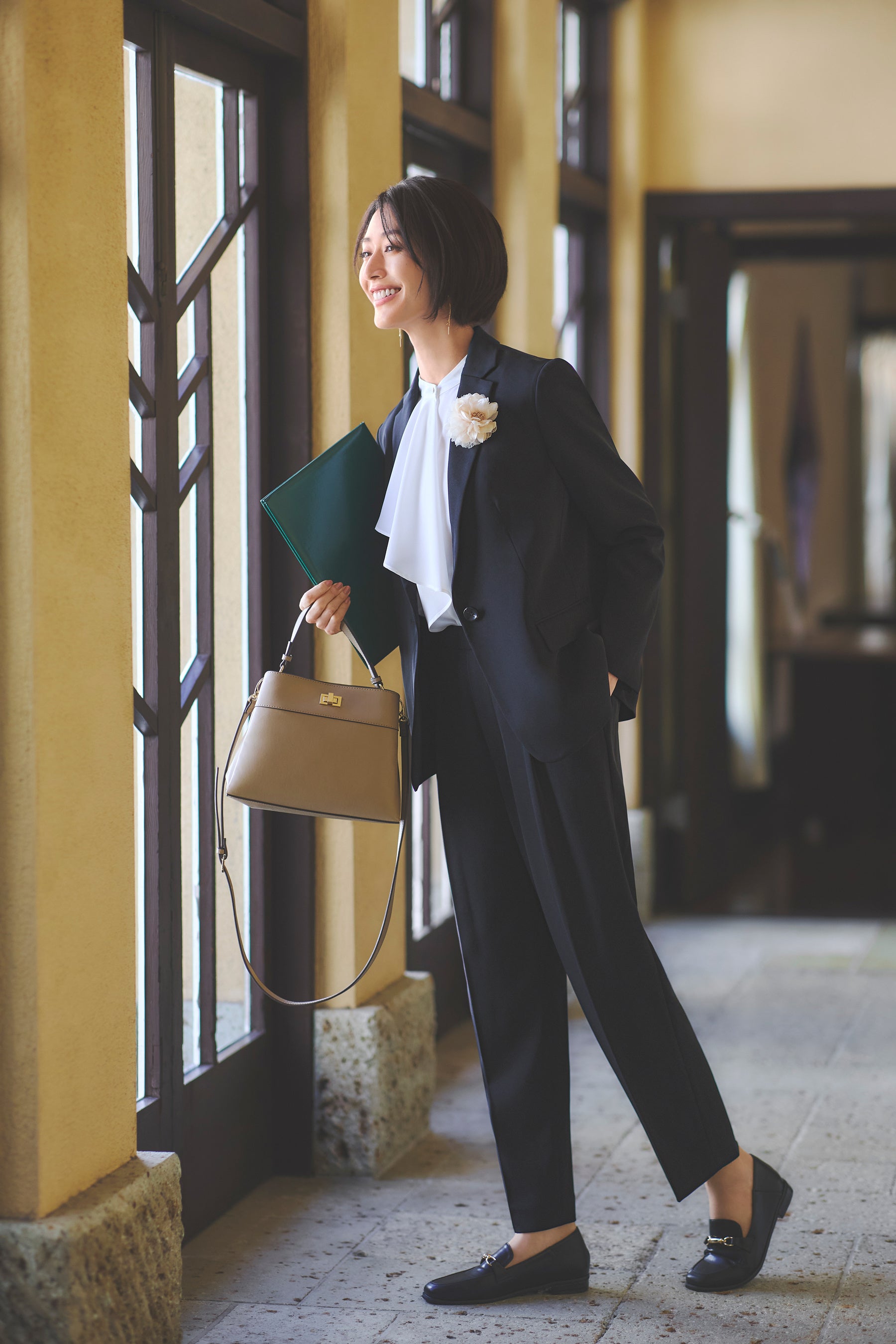 入卒式などのセレモニー、そしてお呼ばれや結婚式などお祝いの席にも映える正統派シリーズ。光沢・落ち感のある素材がきちんと感・華やかさを演出する、王道のセレモニーシリーズです。どの角度から見てもとにかく美しいシルエットが魅力。艶感がある素材なので、結婚式などお祝いの席でも着回せます。平服OKな会では、パンツもOK。お祝いの席では、より華やかで明るいカラーの小物合わせを意識すると入卒式とはまた違った見え方にアレンジすることができます。また、着回しを想定し、お祝いの場に使える小物も揃っています。
