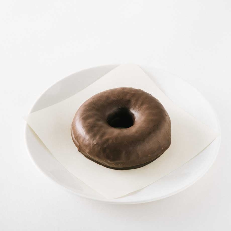 ②プレーンタイプのドーナツをチョコレートでコーティングしました。ビタータイプのチョコレートは甘すぎず、男女年代問わずとても人気の商品です。