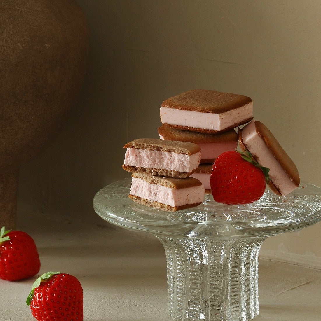 ②フレッシュな苺をかじったときのような酸味がアクセントになった爽やかなチョコレートサンド。人気のピスタチオフレーバーとのハーフセット。