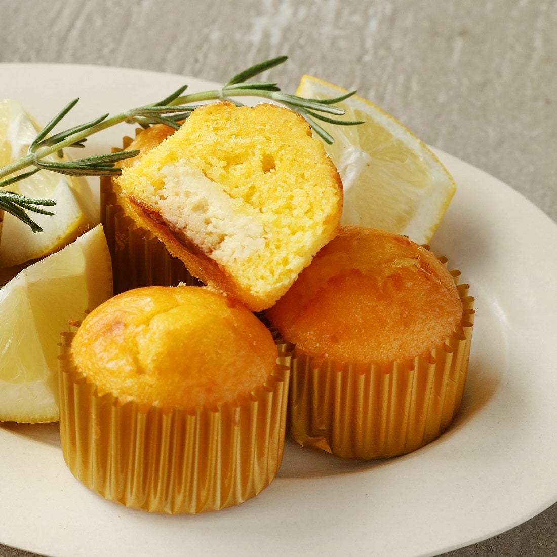 ①しっとりとしたレモンケーキ生地に、ホワイトチョコを入れて焼き上げたフォンダンショコラのようなスイーツ。