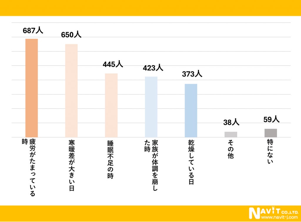 「風邪を引きやすいと思うタイミングはいつですか?」という質問を複数選択可で行ったところ、「疲労が溜まっている時」が687人、「寒暖差が大きい日」が650人、「睡眠不足の時」が445人という順になりました。