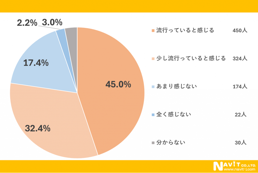 「風邪が流行っていると感じますか?」という質問については、「流行っていると感じる」が45.0%、「少し流行っていると感じる」が32.4%と、合わせると77.4%の人が「風が流行っている」と感じていることが分かりました。