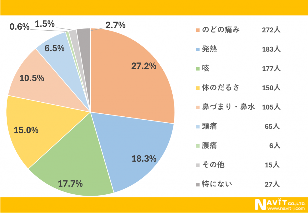 風邪症状で最も辛いと感じることは、「のどの痛み」が最多