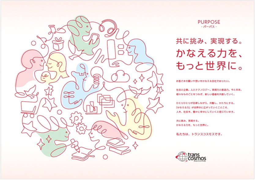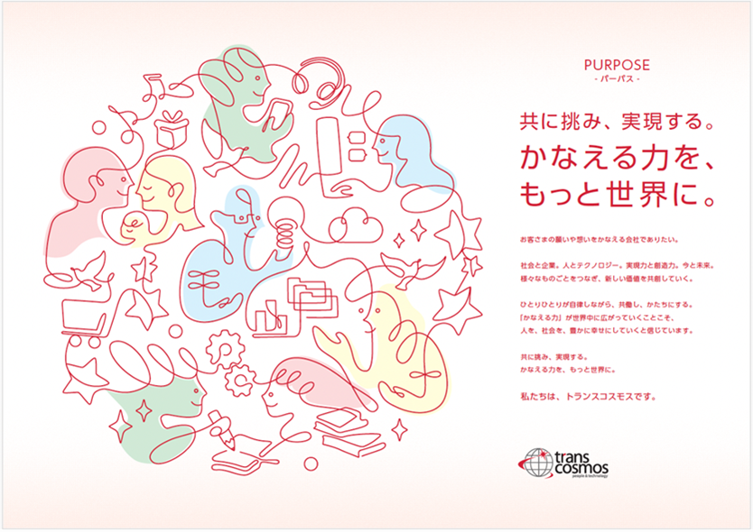 社会やビジネス環境が大きく変化する中で、企業には単なる効率や技術力だけでなく、誰と、どのように価値を生み出していくのかが問われています。トランスコスモスは、お客さまや社会と向き合い、構想から実行までを共に考え、共に挑み、共に実現することで、願いや想いを現実の成果としてかたちにしてきました。ひとりひとりの自律した力を重ね合わせながら、その「かなえる力」を、より広く世界へと広げていくため、本パーパスを掲げています。