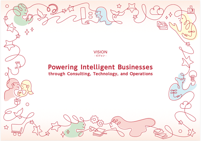 トランスコスモスが中期的に目指す姿として、上記ビジョンを定めました。現在、先進的な企業はIntelligent Business、即ち「AIとデータを核として意思決定と実行を高度化・自律化する次世代ビジネス」への進化を目指しています。私たちはこのトレンドを見据え、オペレーションを核としながら、コンサルティングやテクノロジーの能力を高め、お客様企業の進化を力強く推し進めるエンジンとなることを目指します。