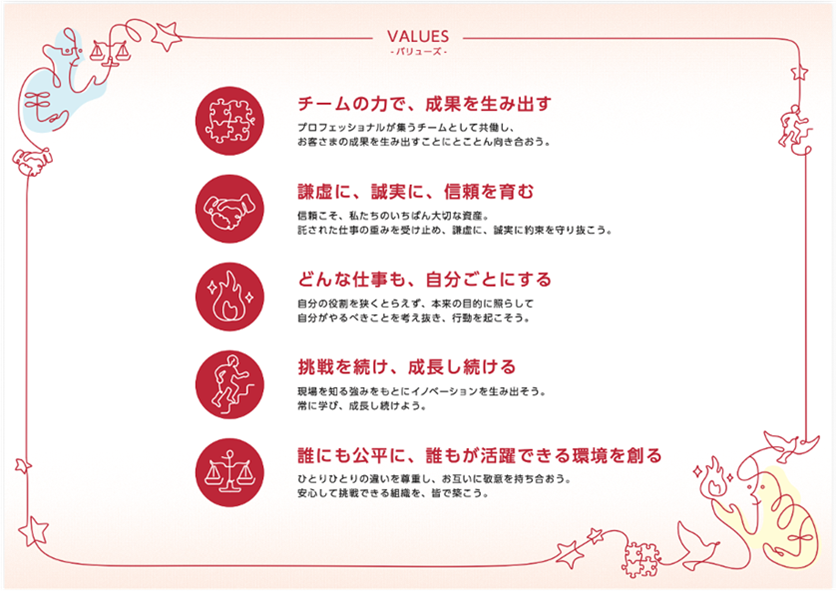 パーパスとビジョンの実現に向け、社員ひとりひとりが日々の意思決定と行動の拠り所とする価値観として、以下の5つを定めました。