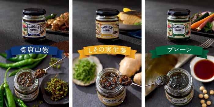 MUGEN-KOMBUシリーズは、北海道産の生昆布をまるごと使用。肉料理にかけたり刺身の薬味にしたり、野菜や豆腐に旨みをプラスするなど、無限の組合せを楽しめる新しい調味料です。