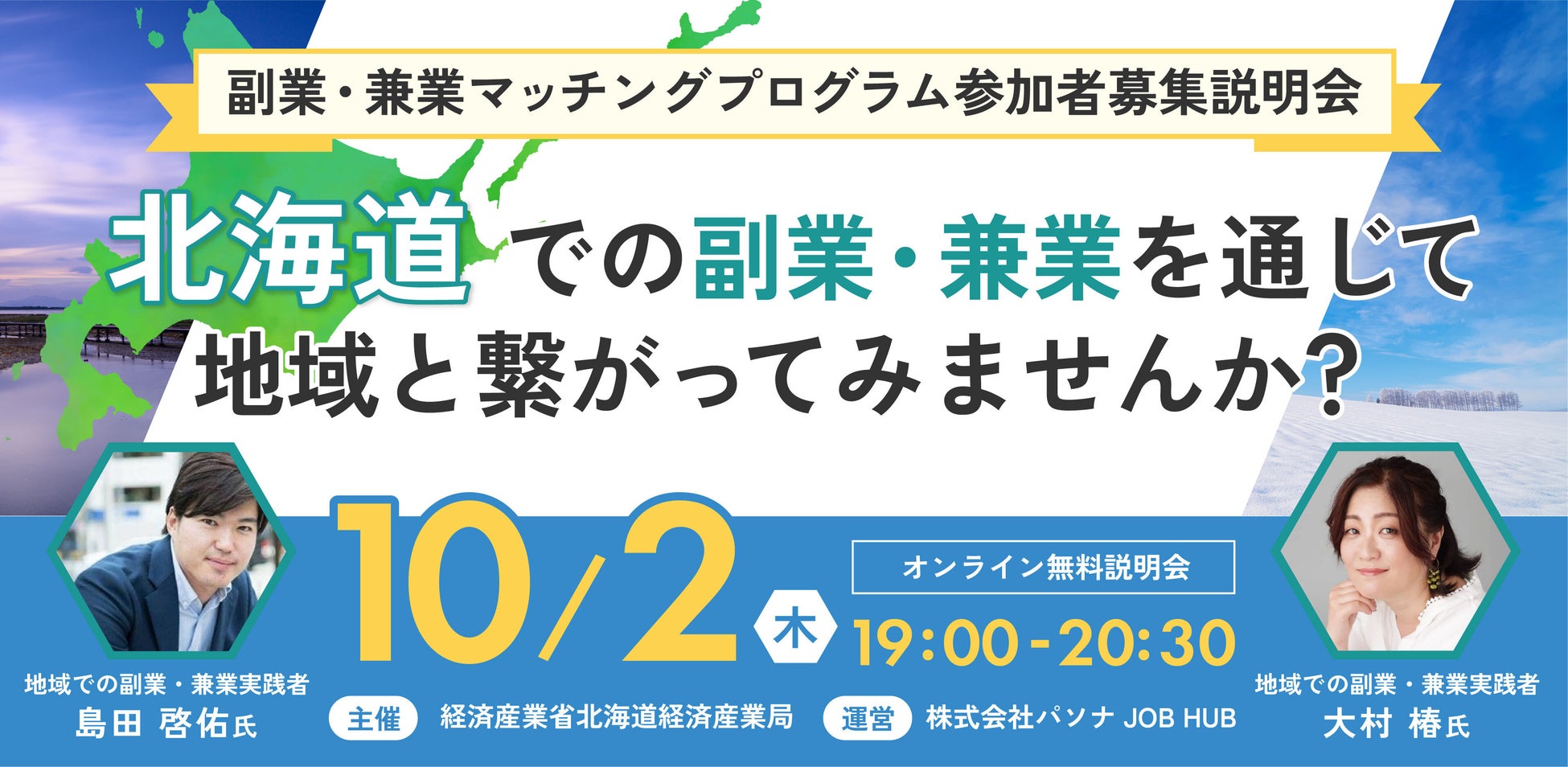 株式会社パソナJOB HUB(本社:東京都港区、代表取締役社長 髙木元義)は、経済産業省北海道経済産業局から受託・運営する「令和7年度 北海道経済産業局における地域中小企業人材確保支援等調査・分析(事業区分A)」の一環として、北海道地域での副業・兼業に興味を持つ方々を対象にしたオンライン説明会『北海道での副業・兼業を通じて地域と繋がってみませんか?』を10月2日(木)に開催いたします。