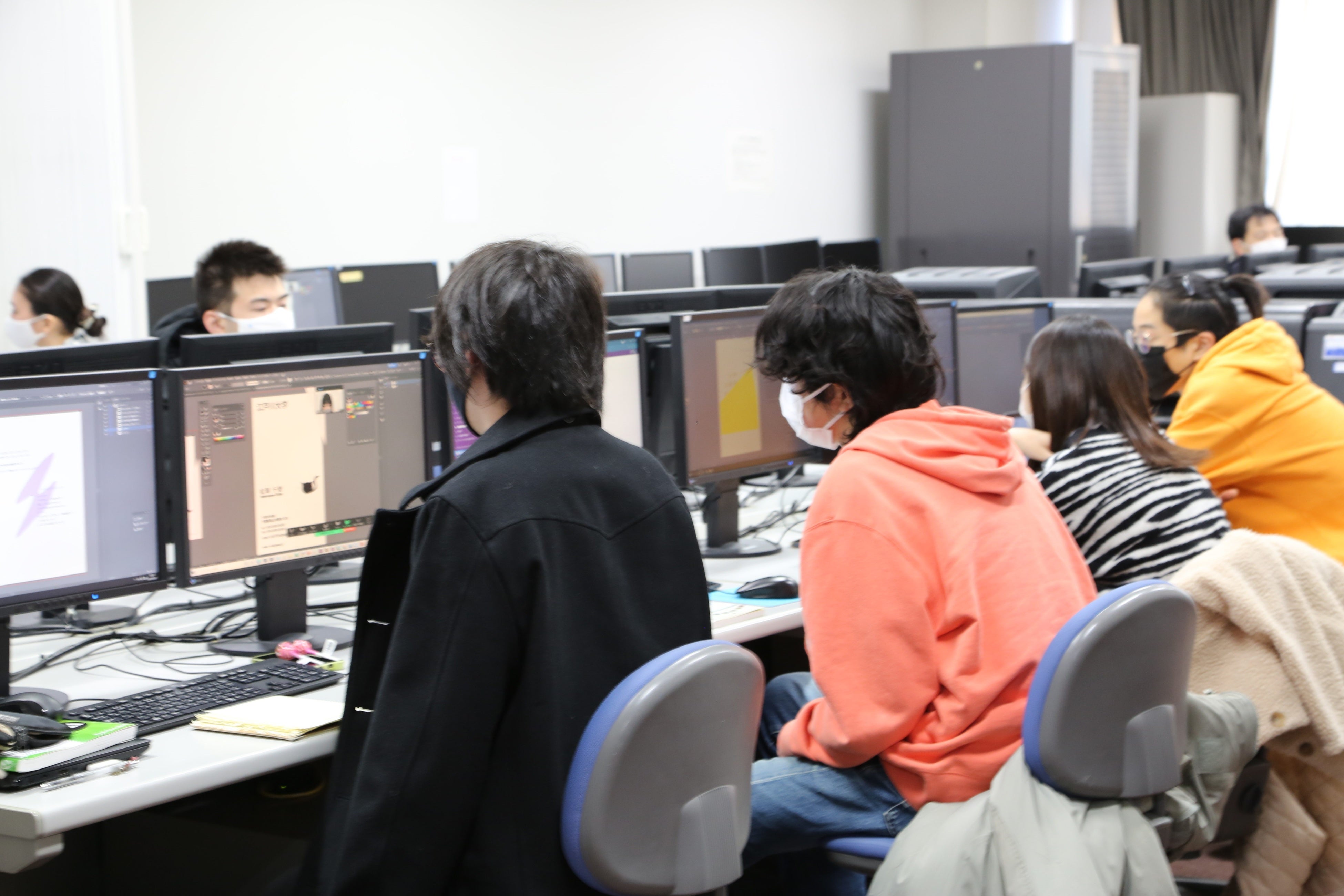 大学の冬期休み期間を利用して実施。計4日間の授業日の内、3日間を対面、1日をオンラインで実施しました。オンラインで作品講評を行った最終日以外は、2時間の講義(+課題の講評)の後、課題の制作時間と自由に講師の先生に質問が行えるオフィスアワーの時間を確保。予定していた授業時間を終了しても課題に取り組む学生も多くみられたことが大変印象的でした。