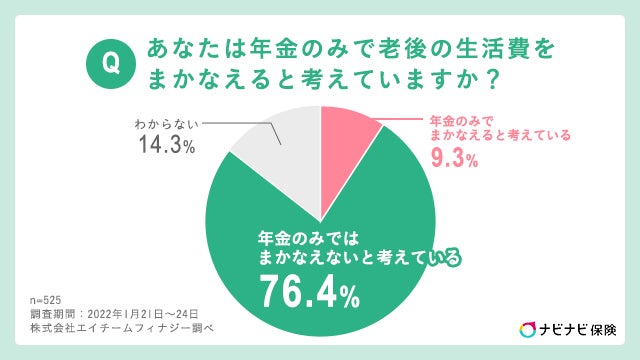 続いて、「年金のみで老後の生活費をまかなえると考えていますか?」と質問をしたところ、「年金だけではまかなえないと考えている」が76.4%と最も多い結果となりました。