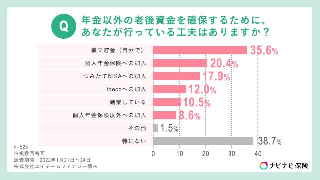 一方で、「年金以外の老後資金を確保するために行っている工夫はありますか?」という質問に対しては、なんと38.7%が「特にない」と回答しました。