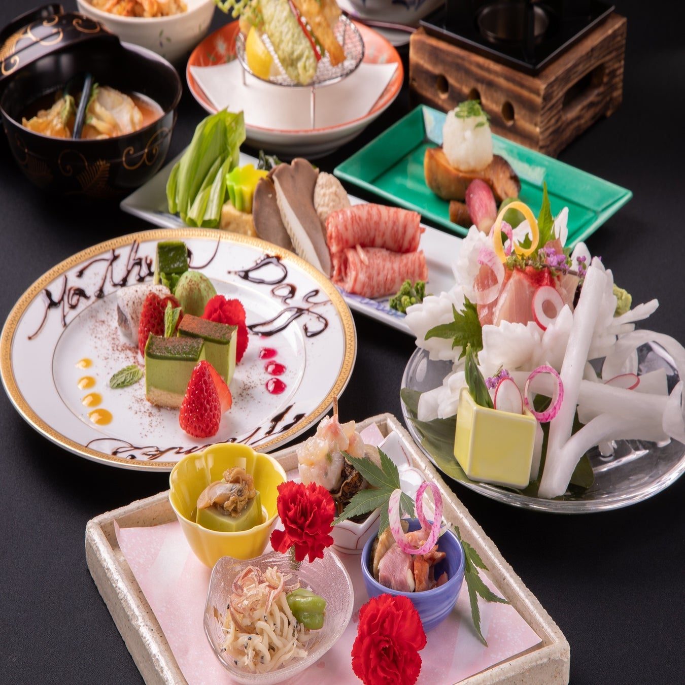 (先付・前菜・吸物・お造り・小鍋・焼物・強肴・食事・デザート)
