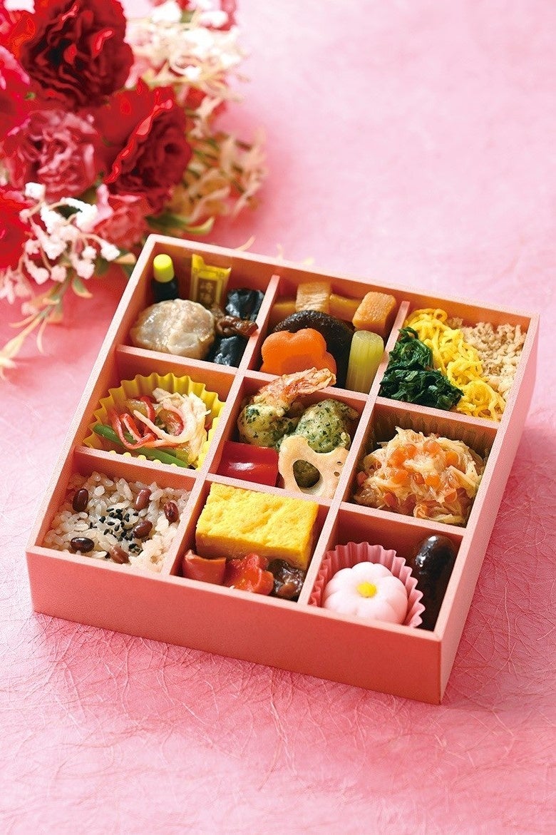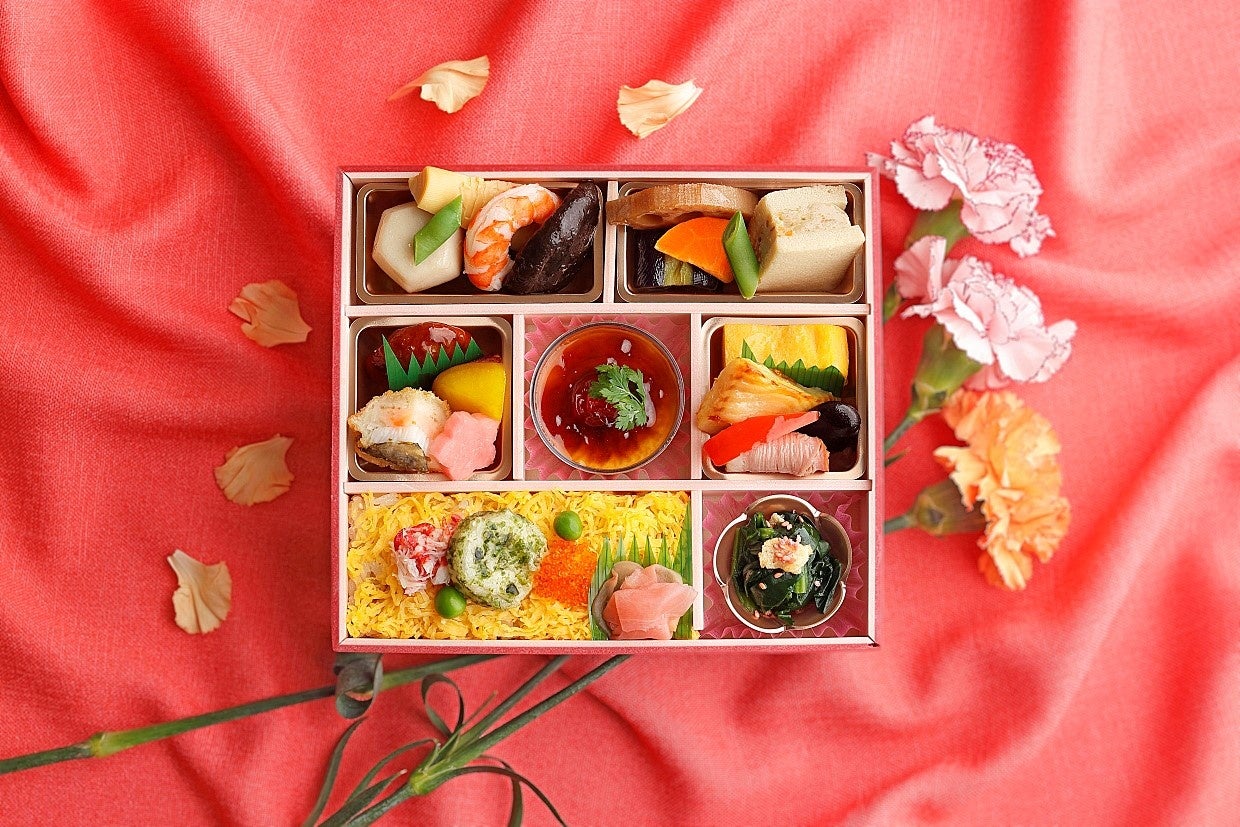 華やかなちらし寿司をはじめ、鰈西京焼や山芋の海鮮詰めフライ、だしの風味豊かな煮物などの料理に、ココナッツミルクゼリーを詰めたお弁当です。