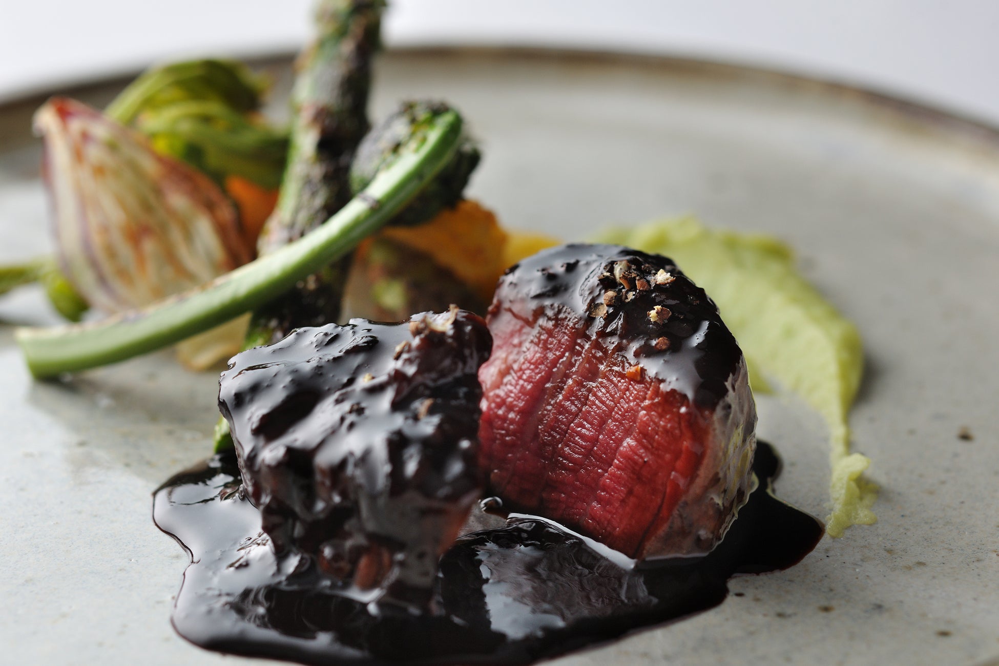 メインディッシュは、牛フィレ肉に炭火の香りをまとわせ赤ワインで煮込んだ一皿です。ペポーゾとは、牛肉を黒胡椒と赤ワインで長時間じっくり煮込んだイタリア・トスカーナ州の郷土料理のこと。OTTO SETTE NASUではお肉の食感を楽しめるように、煮込み時間を調整しロゼ色で提供します。炭火で焼いた牛フィレ肉に、アクセントとしてスパイスを加えた赤ワインソースを合わせました。付け合わせには、春に旬を迎える山菜を炭火で焼き上げて提供します。