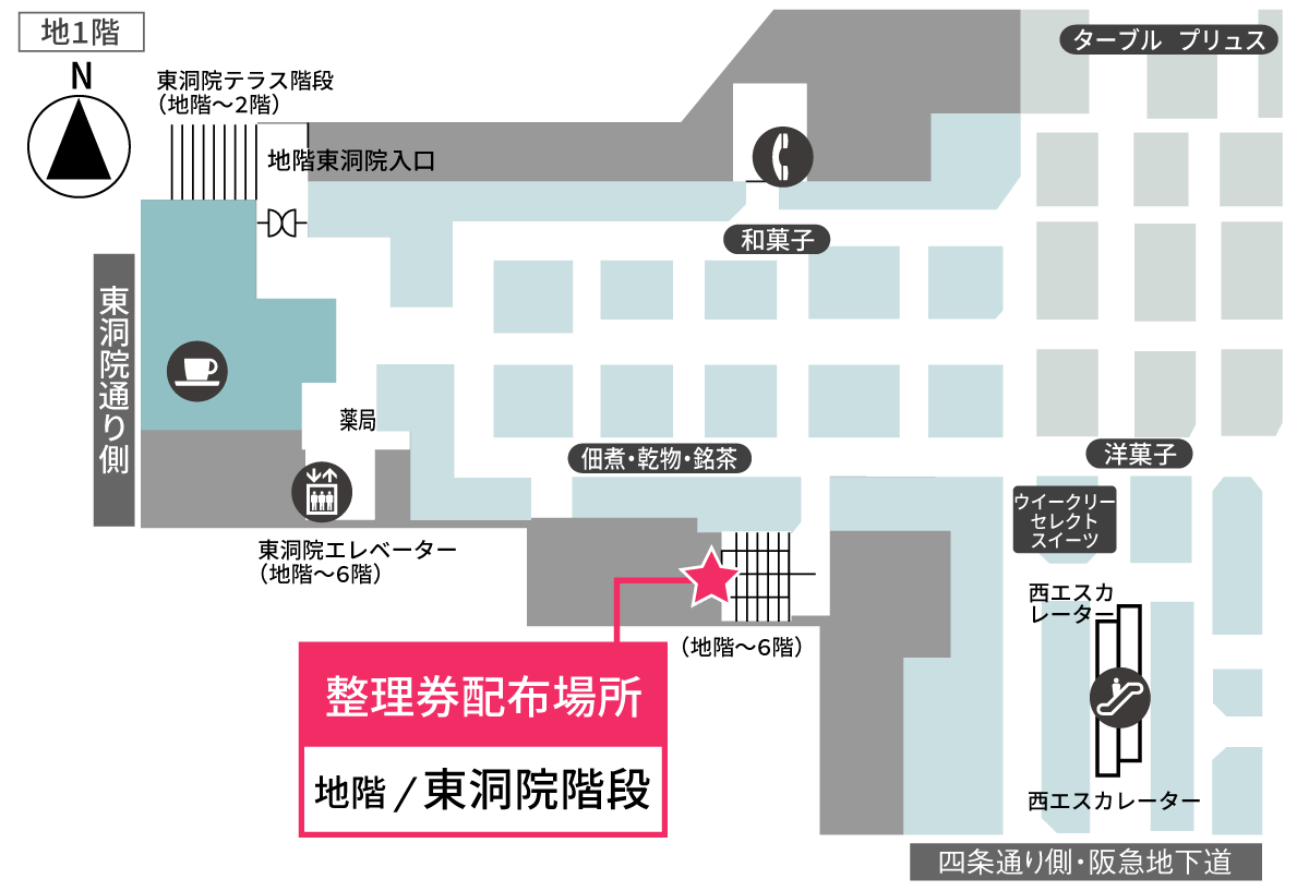 開店後、地階東洞院階段にて整理券を配布いたします。ご購入をご希望のお客様は、マップ☆印までお越しください。