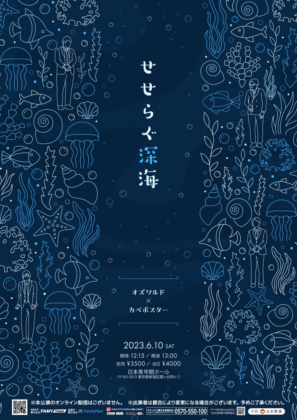 「第42回ABCお笑いグランプリ」チャンピオン、「M-1グランプリ」2019年~2022年4年連続ファイナリストのオズワルドと、 「第43回ABCお笑いグランプリ」チャンピオン、「第11回ytv漫才新人賞」優勝、「M-1グランプリ2022」では初の決勝進出、見事8位に輝いたカベポスターによるツーマンライブ「せせらぐ深海」は、2020年8月に大阪・COOL JAPAN PARK OSAKA WWホールにて第一回公演を実施。2021年には東京・ルミネtheよしもと、大阪・なんばグランド花月の東阪最高峰の劇場で2公演開催しました。