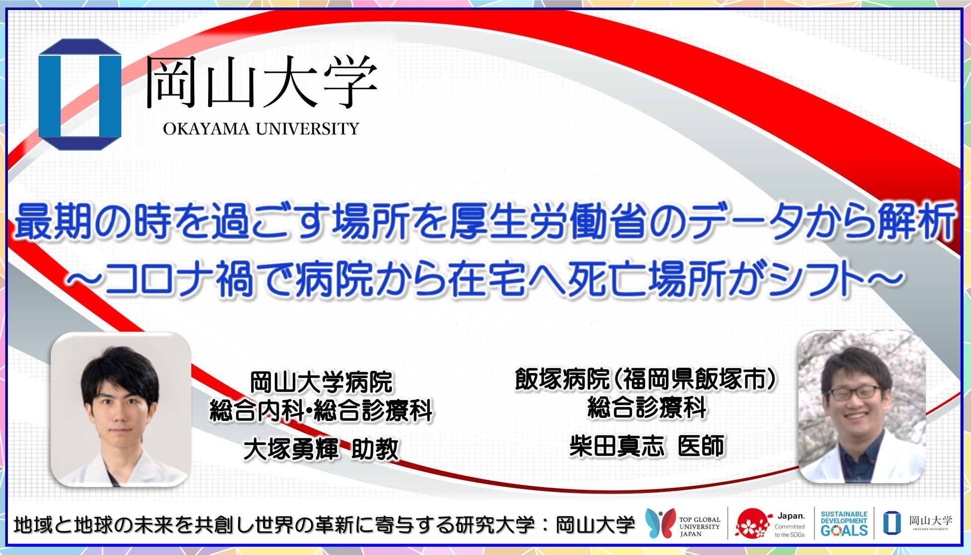 2024年3月19日、国立大学法人岡山大学(本部:岡山市北区、学長:那須保友)の岡山大学病院総合内科・総合診療科の大塚勇輝助教、感染症内科の萩谷英大准教授、岡山大学学術研究院医歯薬学域医療教育センターの小山敏広准教授と、飯塚病院(福岡県飯塚市)総合診療科の柴田真志医師らでつくる研究グループは、国民が最期の時を過ごす場所が新型コロナウイルス感染症(COVID-19)流行下において変化していることを明らかにしました。