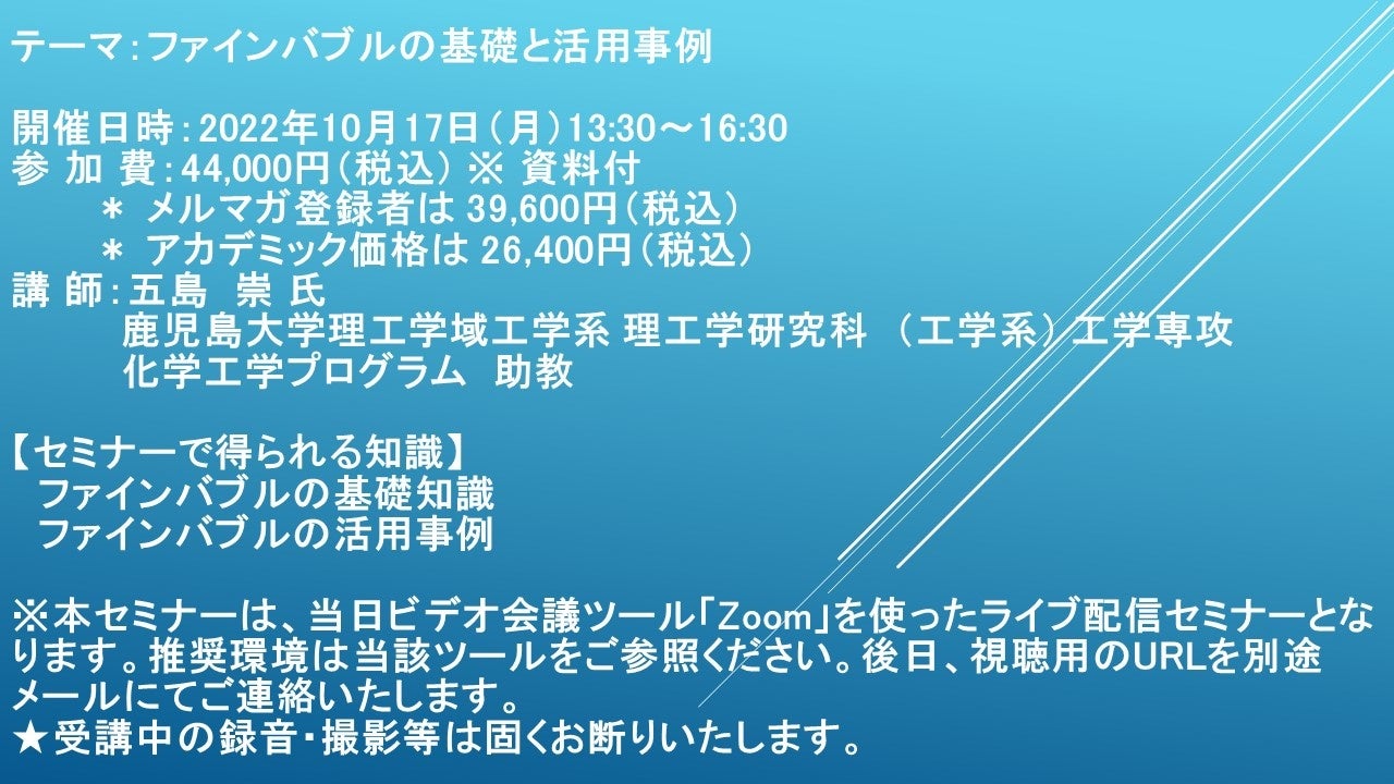 先端技術情報や市場情報を提供している(株)シーエムシー・リサーチ(千代田区神田錦町: https://cmcre.com/ )では、 各種材料・化学品などの市場動向・技術動向のセミナーや書籍発行を行っておりますが、 このたび「ファインバブルの基礎と活用事例」と題するセミナーを、 講師に五島 崇 氏 鹿児島大学理工学域工学系 理工学研究科 (工学系) 工学専攻 化学工学プログラム 助教)をお迎えし、2022年10月17日(月)13:30より、 ZOOMを利用したライブ配信で開催いたします。 受講料は、 一般:44,000円(税込)、 弊社メルマガ会員:39,600円(税込)、 アカデミック価格は26,400円(税込)となっております(資料付)。