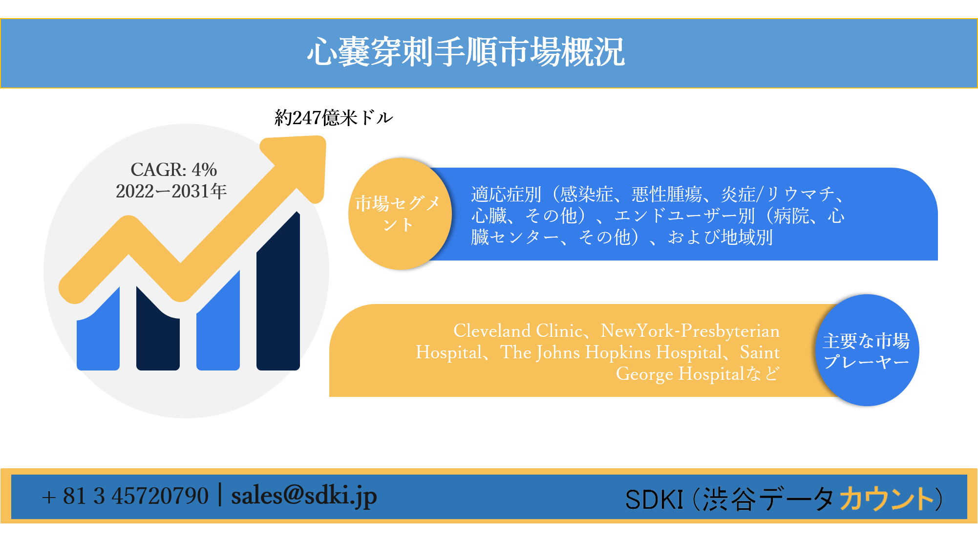 SDKI Inc.は、「心嚢穿刺手順市場ー世界の予測2022ー2031年」新レポートを 2022年03月07日に発刊しました。この調査には、心嚢穿刺手順市場の成長に必要な統計的および分析的アプローチが含まれています。レポートで提供される主要な産業の洞察は、市場の既存のシナリオに関する読者に市場の概要についてのより良いアイデアを提供します。さらに、レポートには、市場の成長に関連する現在および将来の市場動向に関する詳細な議論が含まれています。
