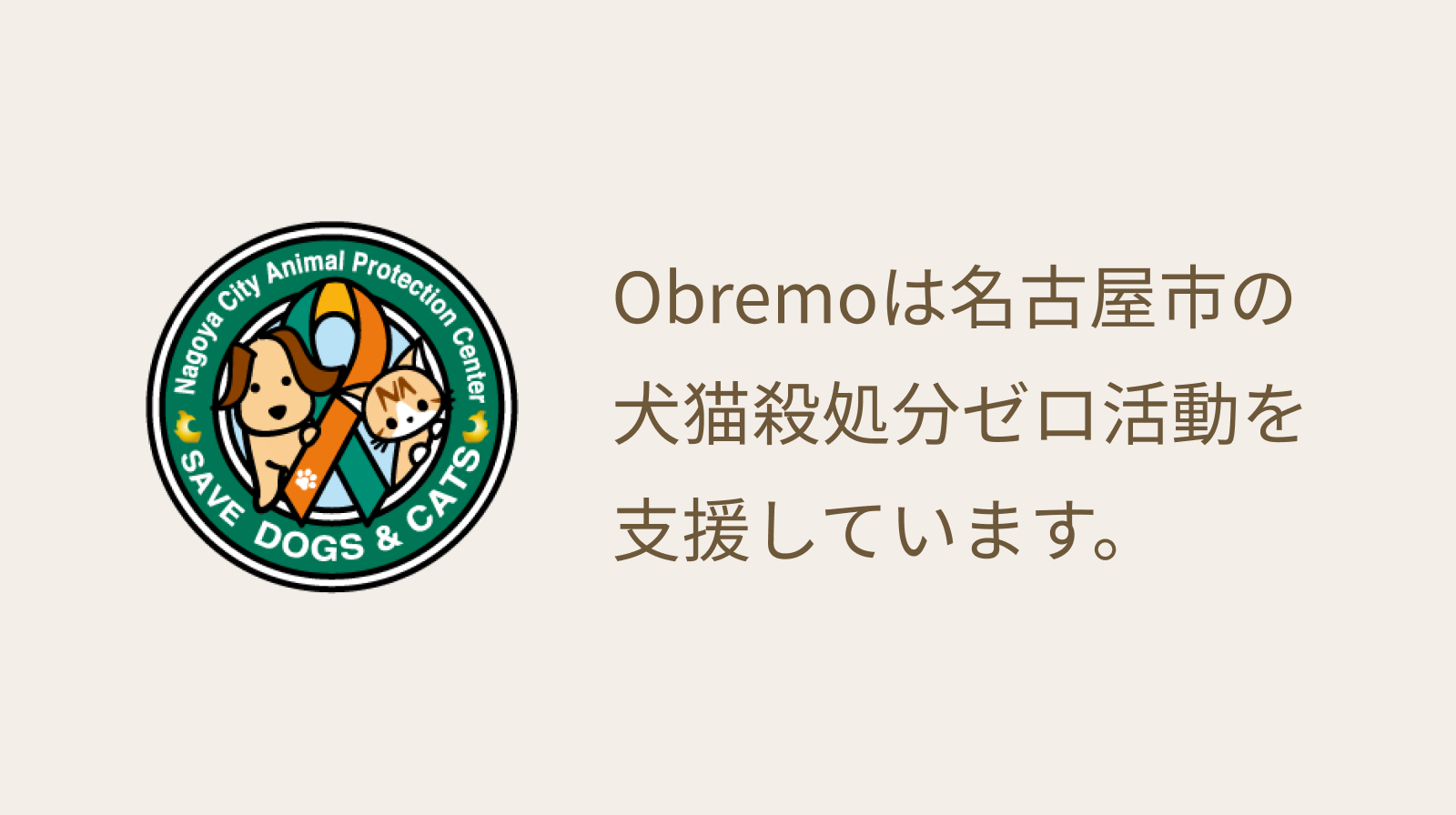 また、Obremoは名古屋市の犬猫殺処分ゼロ活動を支援し、人とワンちゃんネコちゃんが共存できるようObremoとしてできることに努めてまいります。