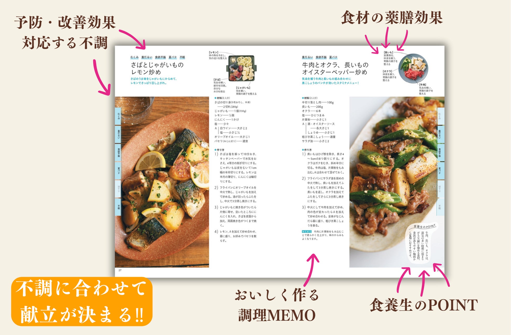 すべてのレシピに写真と食材の持つ薬膳効果を表示。この料理を食べることで得られる予防・改善効果や、対応する不調まで、アイコンでひと目でわかるから、気になる不調に合わせてメニューを自由に組み合わせられます。さらに、主菜から副菜、汁物まで、これ1冊で手軽に献立が完成します。