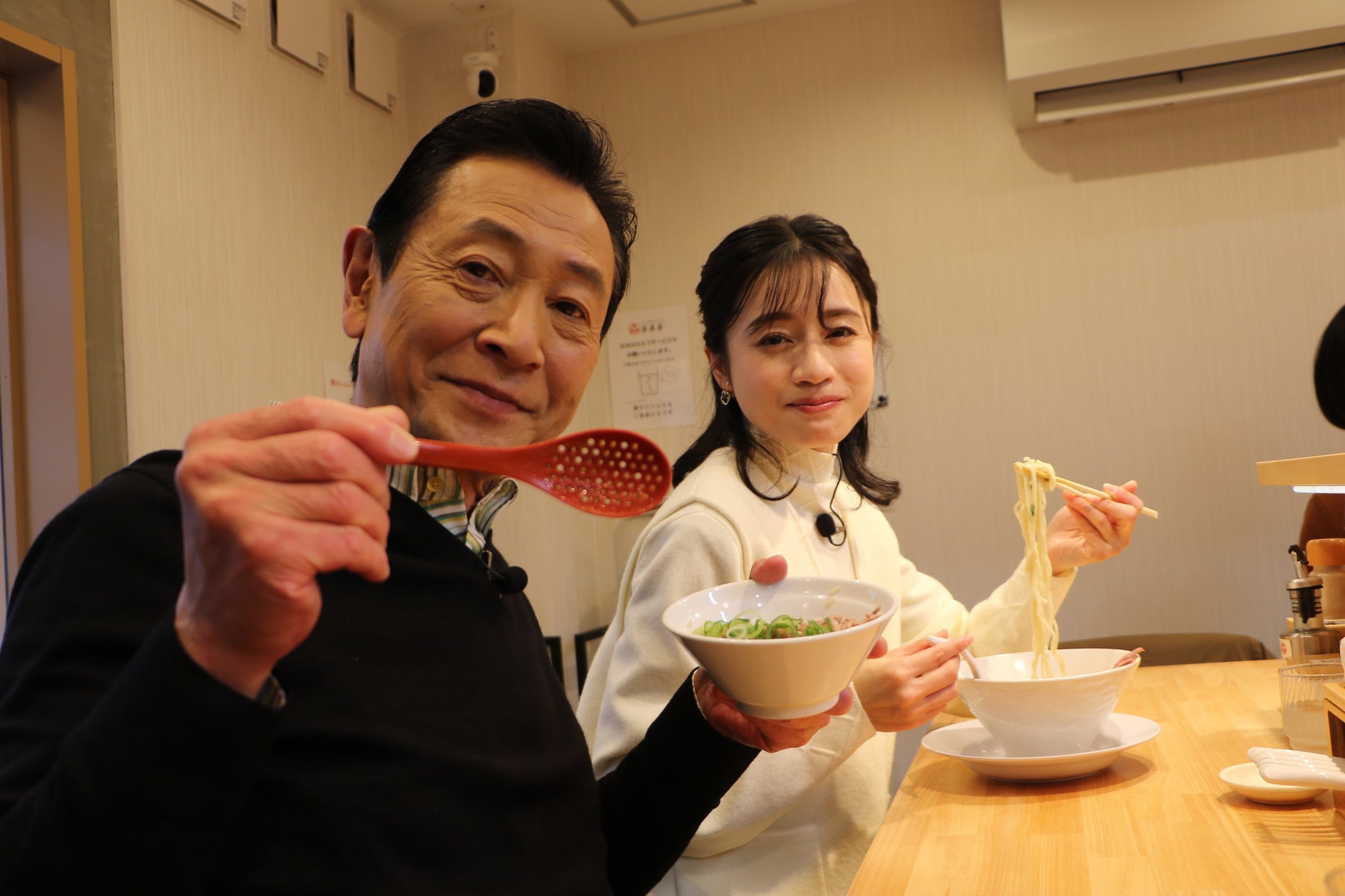 関西大学の正門から延びる通りはラーメンロードとも呼ばれ、 10軒以上が鎬を削る、ラーメン激戦区!その中で昨年オープンした大阪初、ラム白湯専門店【羊羊羊】へ。羊の骨だけで出汁をとるという、羊にこだわったお店で三田村は『ラム白湯担々麺』の激辛を。斉藤は『ラム白湯ラーメン』の全部のせをいただきます。「めっちゃ好きな味!」と三田村、「パンチのある味!」と斉藤もお気に入り。