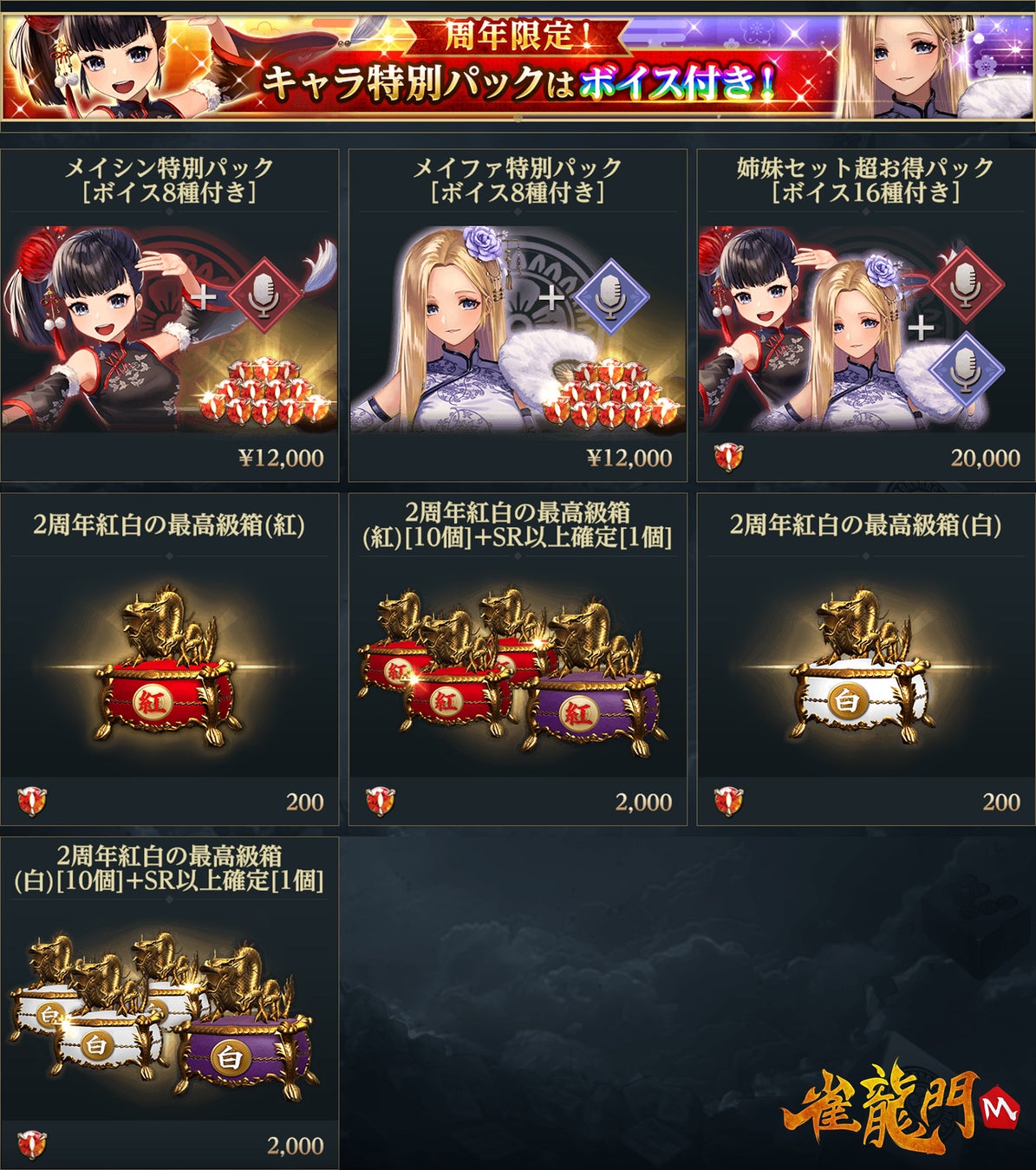 「2周年紅白の最高級箱[10個](紅or白)+SR以上確定[1個]」では、キャラやメイファとメイシンの演出も獲得のチャンスがUPします!