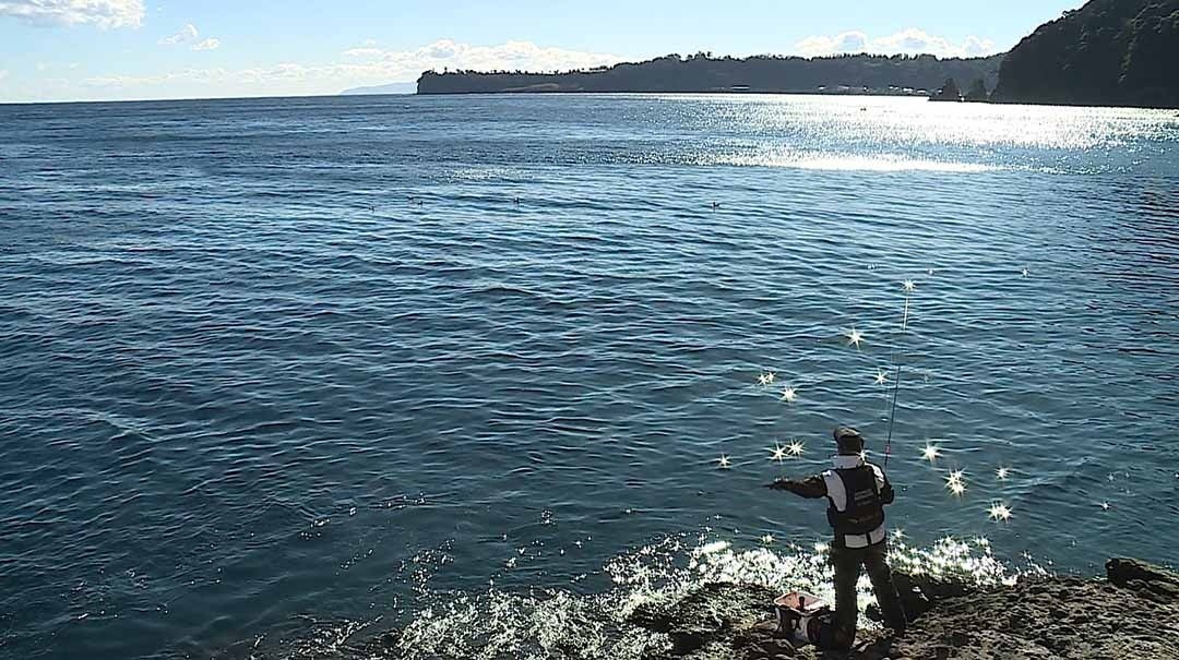 伊東市は伊豆半島東岸中央付近に位置し、静岡県の最東部に当たる市だ。中でも新居白砂から川奈へかけての海岸線は岩場が続き、今回の舞台となった汐吹崎 汐吹崎公園にある汐吹岩では絶壁の中に開いた洞に波が当たり、潮が吹きあがる光景が知られる。汐吹崎公園の駐車場からもほど近く行きやすいポイントでありながら、本格的な磯釣りができる地磯として知られる。人気の釣りとしてはフカセ釣りでのグレやルアーでのロックフィッシュ、季節によってはヒラスズキや青物の回遊なども見られる好釣り場となっている。