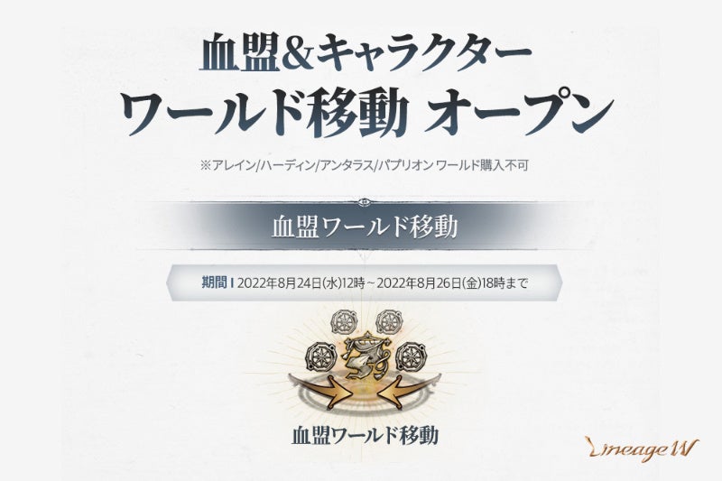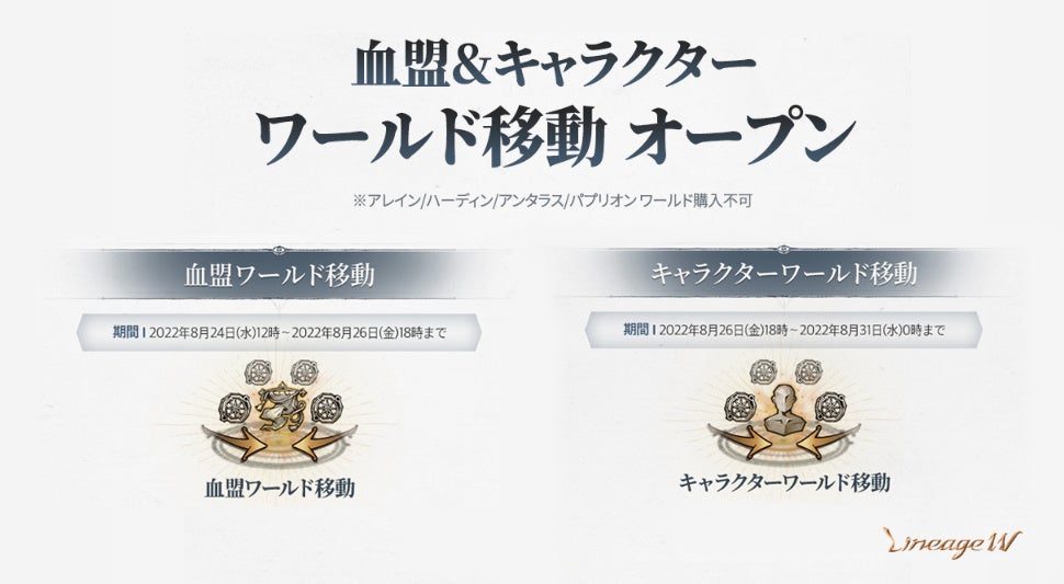 本日12時より「血盟ワールド移動」を、8月26日(金)18時より「キャラクター ワールド移動」を開始します。