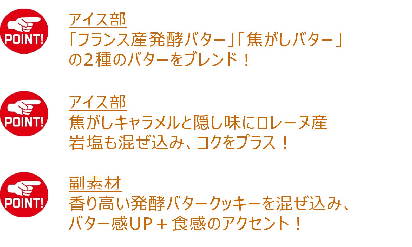 アイスにはフランス産発酵バターと焦がしバターを混ぜ込み、コク深いバターの風味を表現しています。 (フランス産発酵バター:製品中13.7%使用)