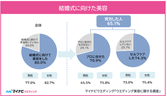 結婚式に向けて美容に関する取り組みをした割合は80.0%となり、結婚式を行う上で自分磨きは欠かせないものとなっている。内訳をみてみると、「プロにお任せした」が70.9%、「セルフケアをした」が74.3%であり、両方取り組んだ人は、65.1%に達した。