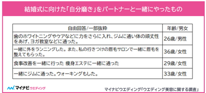 結婚式に向けた「自分磨き」をパートナーと一緒にやったものを自由回答で聞いたところ、「歯のホワイトニングやケアなどに力をさらに入れた(26歳男性)」「一緒に外をランニングした。 また、私の行きつけの眉毛サロンで一緒に眉毛を整えてもらった(36歳女性)」「食事改善を一緒に行った 痩身エステに一緒に通った(29歳女性)」などの声が挙がった。