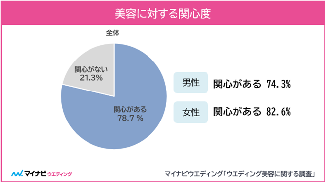2022年8月~2024年9月に結婚式を行った20~39歳までの男女の美容に対する関心度について、約8割が「関心がある」と回答し、男性74.3%、女性82.6%と男女ともに美容に対する関心の高さがうかがえた。【図1】