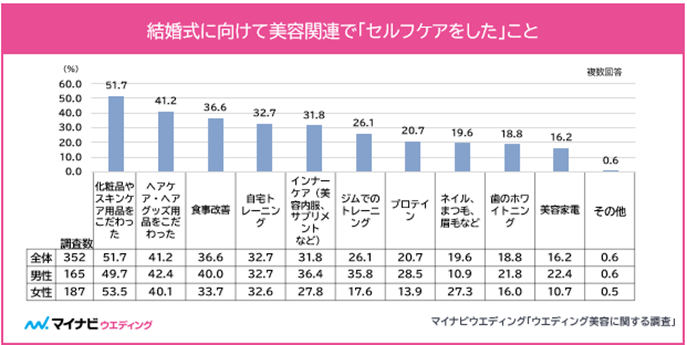 男女別でみても、男性でも「美容をした」割合は7割を超え、結婚式の美容=「花嫁美容」という印象があったが、昨今は男性も結婚式に向けて何かしらの美容に関する取り組みを行っていることが明らかになった。
