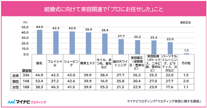 結婚式に向けて美容関連で「プロに任せた」中で最も多かったのは、「脱毛(44.9%)」 次いで「フェイシャル(42.3%)」、「シェービング(42.0%)」となった。男女でプロにお任せする項目は異なり、男性は「脱毛(53.4%、女性比+15.1pt)」「歯のホワイトニング(35.8%、女性比+14.5pt)」などが女性より高く、女性は「ネイル、まつ毛、眉毛など(55.3%、男性比+38.4pt)」「フェイシャル(46.3%、男性比+9.1pt)」が男性より高かった。
