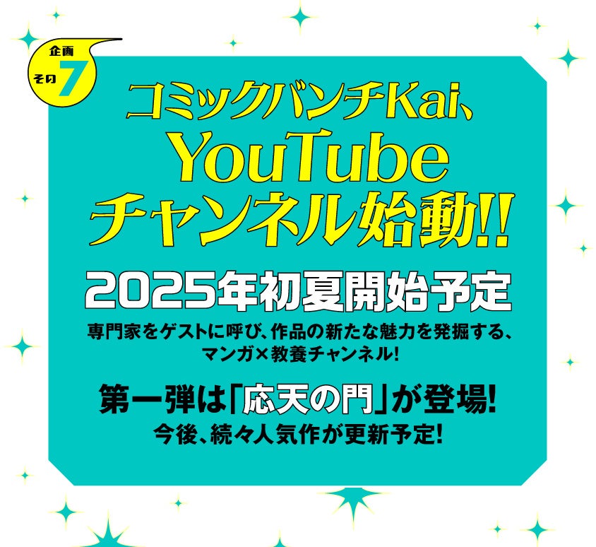 サイトオープンから1周年を記念して、2025年初夏より「コミックバンチKai」のYouTubeチャンネルを始動します。毎回専門家をゲストに呼び、作品の新たな魅力を発掘するマンガ×教養チャンネルとして配信を開始。