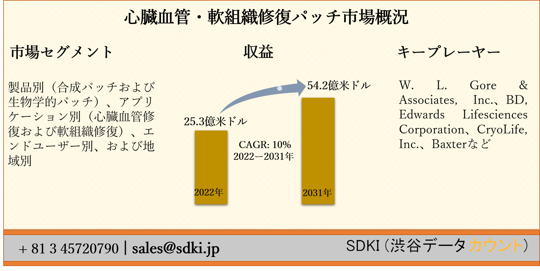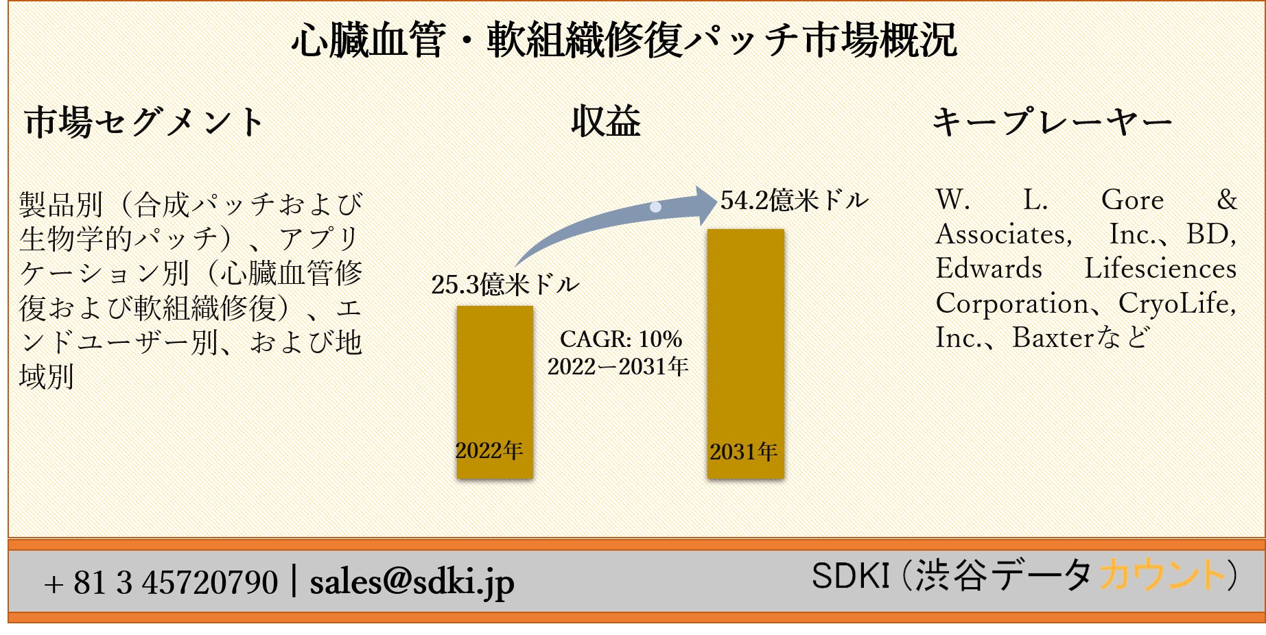 SDKI Inc.は、「心臓血管・軟組織修復パッチ市場ー世界の予測2022ー2031年」新レポートを 2022年03月07日に発刊しました。この調査には、心臓血管・軟組織修復パッチ市場の成長に必要な統計的および分析的アプローチが含まれています。レポートで提供される主要な産業の洞察は、市場の既存のシナリオに関する読者に市場の概要についてのより良いアイデアを提供します。さらに、レポートには、市場の成長に関連する現在および将来の市場動向に関する詳細な議論が含まれています。
