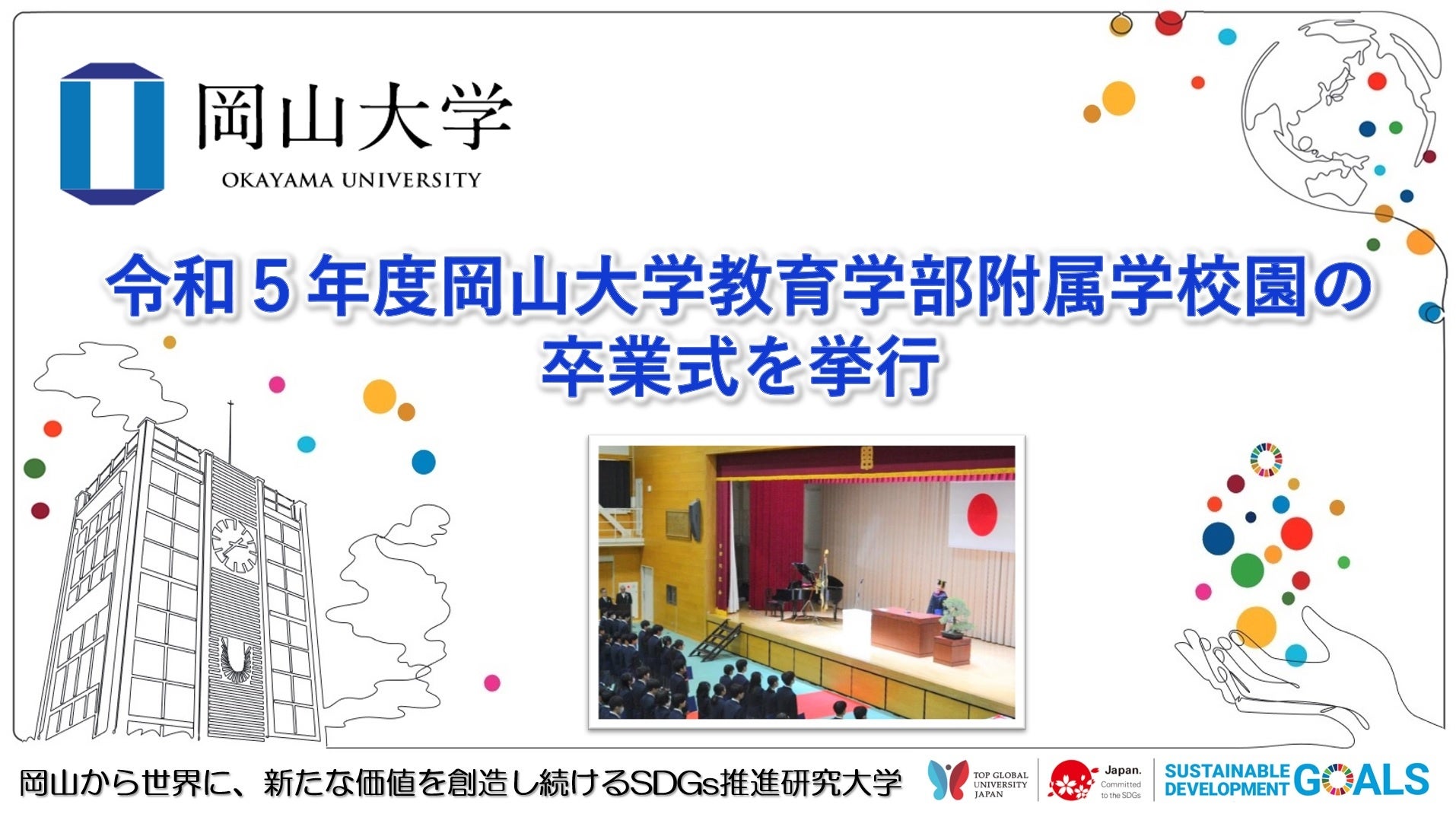 国立大学法人岡山大学(本部:岡山市北区、学長:那須保友)は、2024年3月12~18日に、令和5年度岡山大学教育学部附属学校園(幼稚園、小学校、中学校、特別支援学校)の卒業式を執り行い、幼稚園(46人)、小学校(99人)、中学校(178人)、特別支援学校(小学部3人、中学部6人、高等部7人)の計339人が卒業しました。