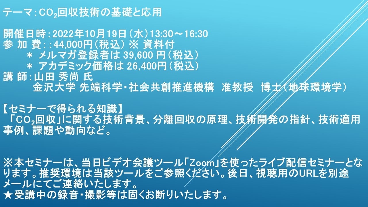先端技術情報や市場情報を提供している(株)シーエムシー・リサーチ(千代田区神田錦町: https://cmcre.com/ )では、 各種材料・化学品などの市場動向・技術動向のセミナーや書籍発行を行っておりますが、 このたび「CO2回収技術の基礎と応用」と題するセミナーを、 講師に山田 秀尚 氏 金沢大学 先端科学・社会共創推進機構 准教授 博士(地球環境学))をお迎えし、2022年10月19日(水)13:30より、 ZOOMを利用したライブ配信で開催いたします。 受講料は、 一般:44,000円(税込)、 弊社メルマガ会員:39,600 円(税込)、 アカデミック価格は26,400円(税込)となっております(資料付)。