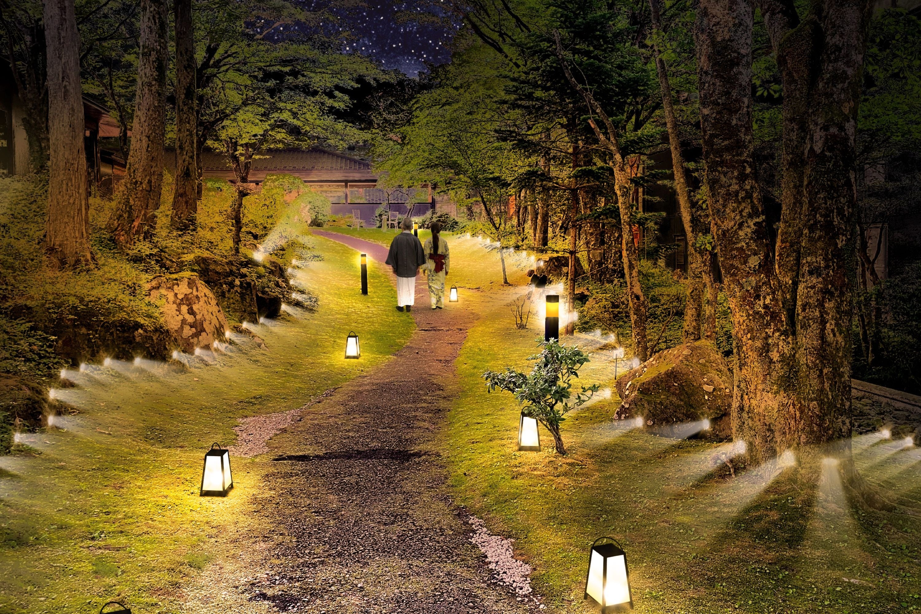 露天風呂を満喫した後は心地よい夜風が火照った体を癒してくれる湯上り散歩へ。自然に囲まれた中庭でマイナスイオンを浴びて、心身ともにリフレッシュ。散歩道にはイルミネーションを設置して幻想的な雰囲気で皆さまをお出迎えいたします。