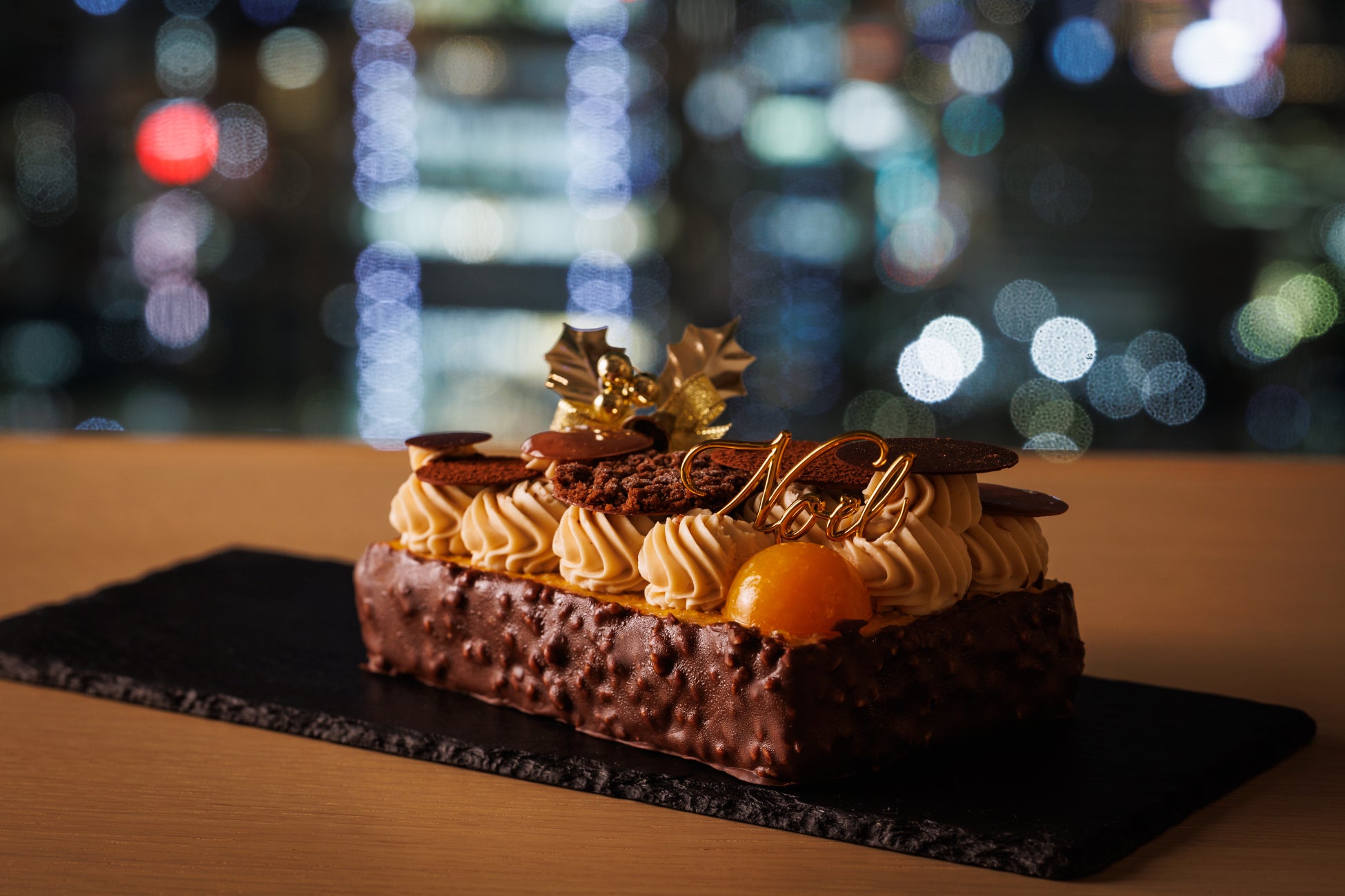 オレンジの爽やかな香りと、ショコラの奥深いマリアージュが楽しめるクリスマスケーキをご用意しました。ビスキュイショコラとクルスティアンのさっくりとした生地に、ムースショコラ、クレームオランジュを重ね、アーモンド入りのチョコレートでコーティング。トップにはブロンドチョコレートのガナッシュモンテを絞り、オレンジの風味を凝縮したセミコンフィオランジュを宝石のように飾りました。