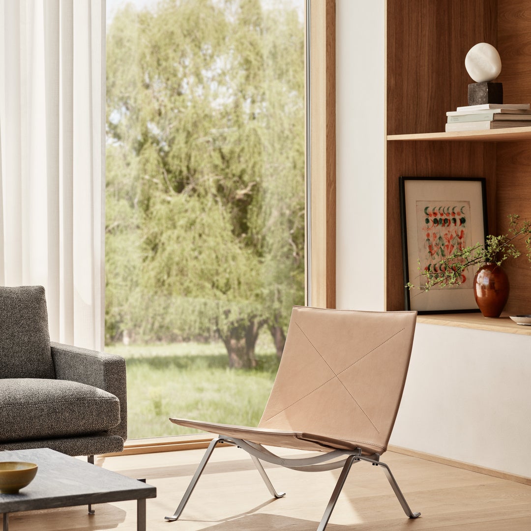 PK22™は、スチール・レザーの素材そのものの美しさやデザインにこだわりが表現された、ポール・ケアホルムの代表作品です。デザイン愛好家にとってもモダンなチェアとして位置づけられています。