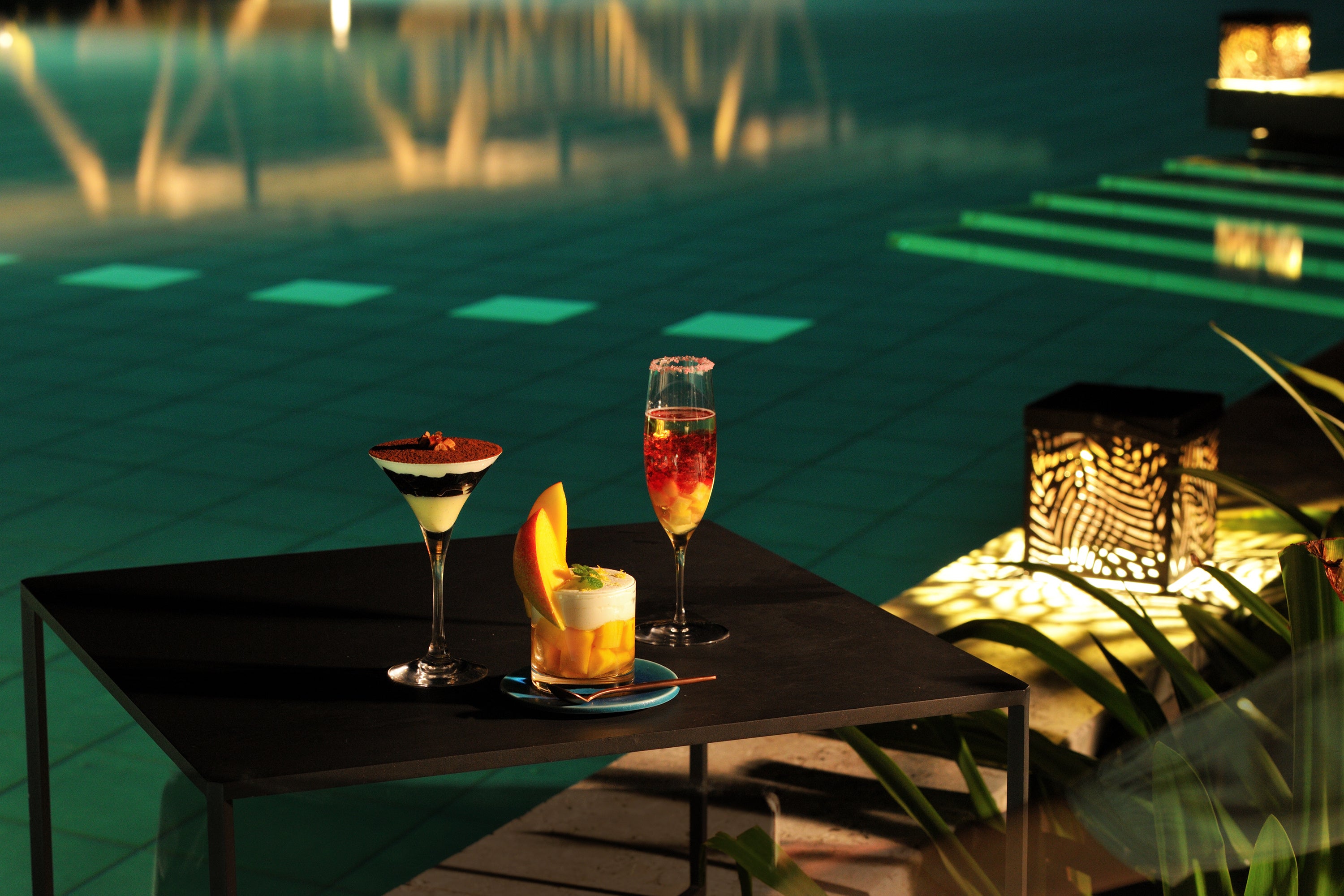 海岸線に寄り添うインフィニティプールは、夜になると波音と静寂に包まれ、水中照明が灯る幻想的な空間へと姿を変えます。 海から渡る心地よい風を感じるプールサイドでは、夕刻から深夜までの移ろいゆく夜の時間を、3つのシーンに合わせたカクテルとともに楽しめます。夕陽を望むアペリティフから、星空の下で味わうデザートカクテル、そして深い夜に沖縄の酒を嗜むひとときまで。涼やかな風を感じながら、日中の暑さを忘れ、心身を解き放つ贅沢な時間を堪能できます。
