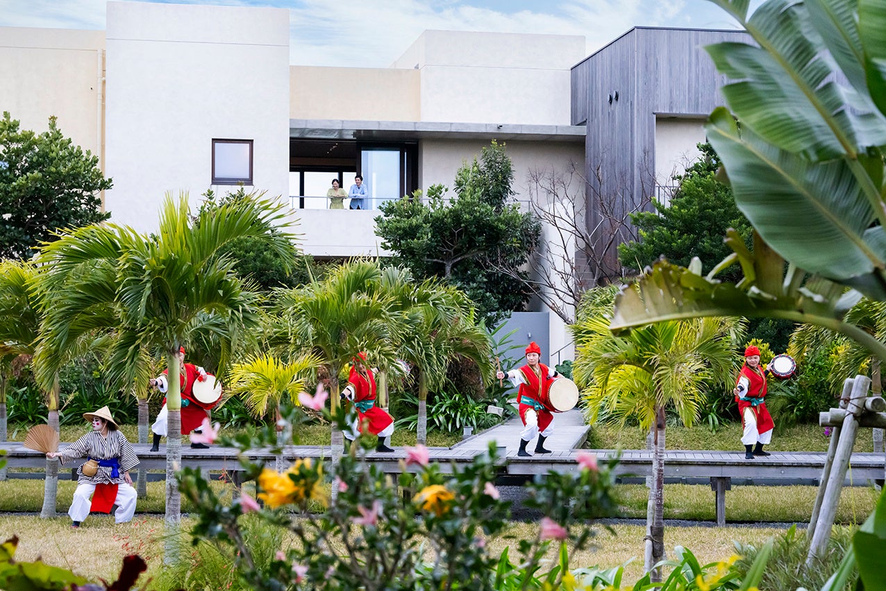 沖縄の旧盆(*2)に欠かせない、先祖を送り出す伝統の舞「エイサー」。最終日の夜には、太鼓の音とともに集落を練り歩く「道ジュネー」が行われ、どこからか聞こえてくるその音色は、沖縄の夏の風物詩です。期間中、星のや沖縄では南国の植物が育つ緑豊かな庭を舞台に、勇壮な道ジュネーを披露します。客室のバルコニーから演舞を眺めたり、庭へ降りて熱気を間近に感じたりと、滞在に合わせた鑑賞スタイルを選択できます。太鼓の音と力強い演舞に、心が躍るひとときです。