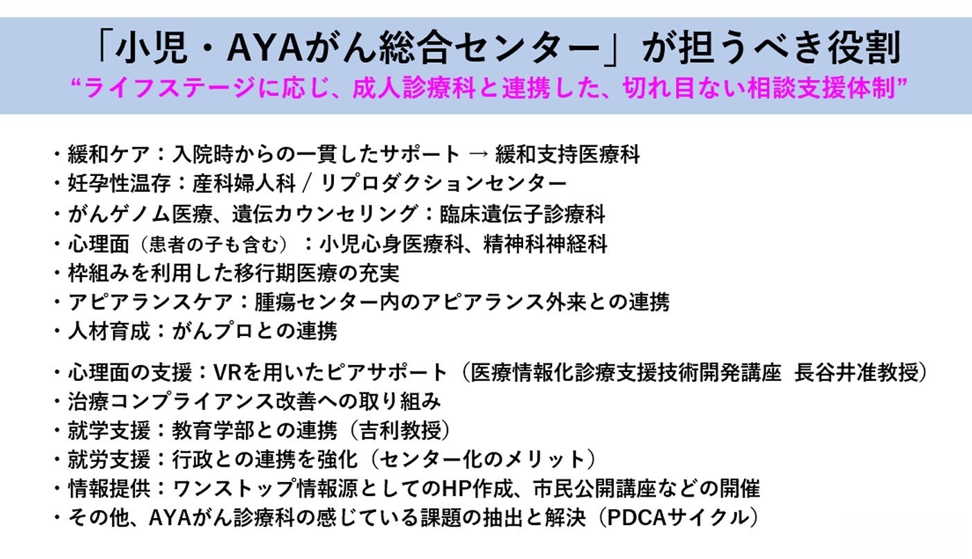 同センターは、診療科等の枠を超えて総合的に小児・AYAがん患者に対して高度な診療と支援を実施し、患者とその家族が安心して適切な診療と支援を受けられる環境を整備するとともに、小児・AYAがんに関するチーム医療に基づいた教育・研究の向上、患者・市民参画の推進、地域の医療機関との連携の充実と発展を目指します。
