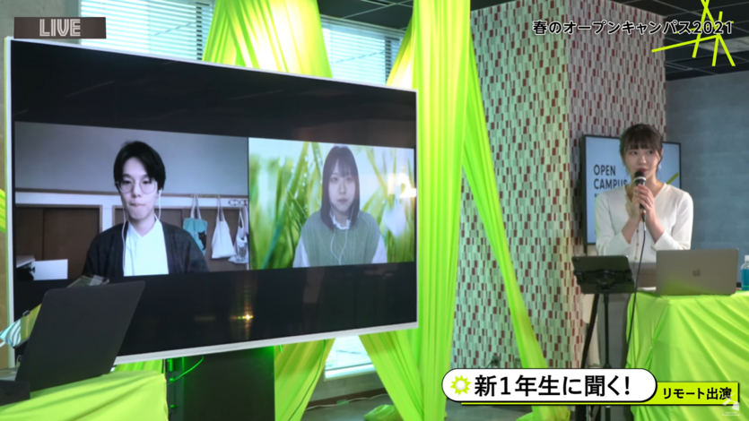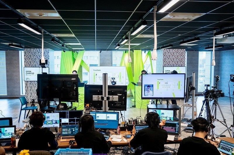 「春のオープンキャンパス」では毎年、杉山知之学長による特別講義や在学生・教職員によるトークセッション、そして新年度入試概要の初公開など、DHUの「いま」を伝えるさまざまな企画・コンテンツを提供しています。2020年以降はYouTube Liveによるオンライン配信を実施し、日本全国そして世界各地から参加できるようになりました。「春のオープンキャンパス2021」では、DHUで映像技術を学ぶ学生を中心に構成されたライブ配信チームがオープンキャンパスとしては異例の4K放送による生中継を行いました。