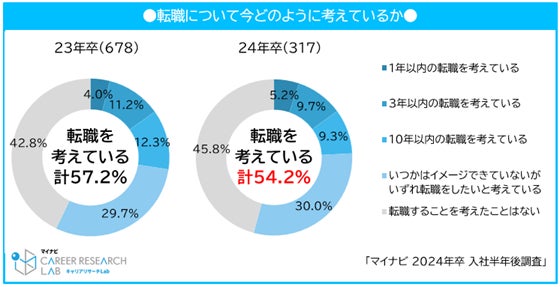 新入社員の転職意向は過半数となるも前年より減少。