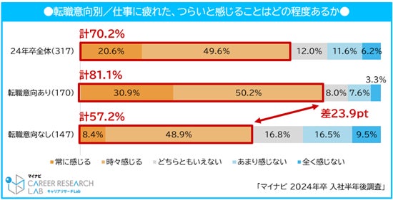 今後の転職意向について聞くと、転職意向がある割合は54.2%で、23年卒の57.2%から3.0pt減少した。「仕事に疲れた、つらい」と感じることがあるかを聞くと、全体で70.2%が「感じる(常に+時々)」と回答した。これを転職意向の有無で比較すると、転職意向なしのグループでは57.2%なのに対し、転職意向ありのグループでは81.1%と、23.9ptの差があった。
