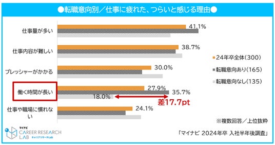 また、仕事に疲れを感じる理由を聞くと、24年卒全体で最も多かったのは「仕事量が多い(41.1%)」だった。転職意向の有無で最も差が開いたのは「働く時間が長い」で、転職意向なしのグループでは18.0%であるのに対し、転職意向ありのグループでは35.7%と17.7pt差となり、長時間の勤務は仕事疲れや、転職意向に繋がる可能性が示唆される。【図9、10、11】